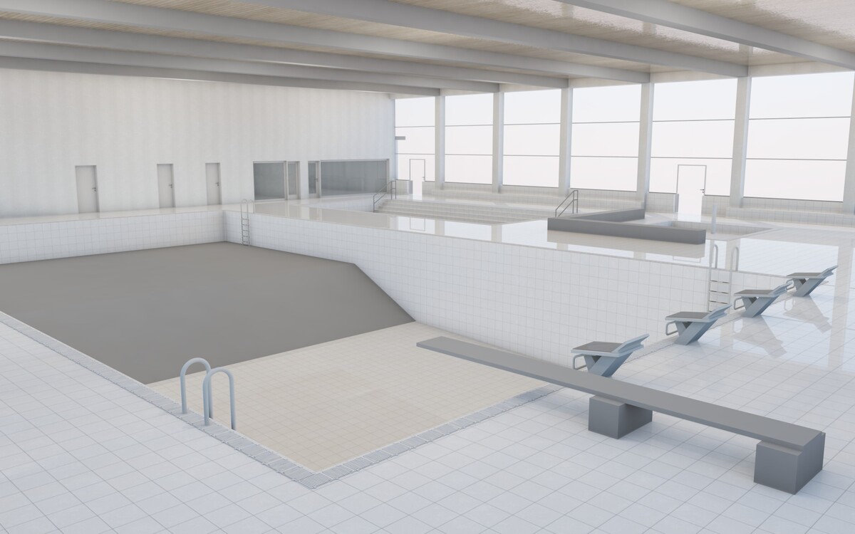 Das bestehende Schulhallenbad wird saniert, um weiterhin betrieben werden zu können. Notwendig sind eine Betonsanierung, eine neue Abdichtung und der Ersatz der Wasseraufbereitungsanlage. An den räumlichen Abläufen wird nichts geändert. Die Wand- und Bodenplatten werden möglichst originalgetreu ersetzt.