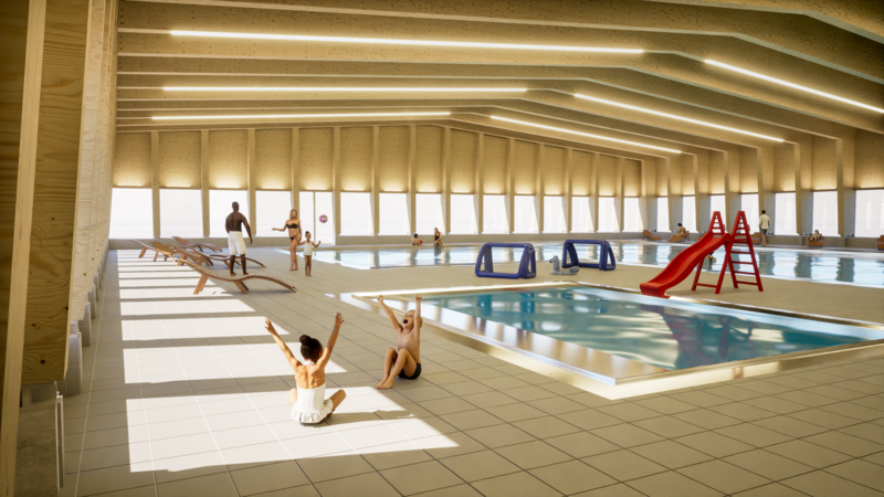 Das Projekt umfasst die Planung eines funktionalen Schwimmbads mit Schwimmer-, Nichtschwimmer- und Planschbecken, das vor allem Schulen, Vereinen und Familien dient. Ergänzend entstehen ein Wellnessbereich und ein Fitnessraum, die zusätzliche Nutzungsmöglichkeiten und Einnahmequellen bieten. Ein kleines Restaurant im Obergeschoss sorgt für Verpflegung und Aufenthaltsqualität. Das Gebäude ist optimal auf Sonne und Erschliessung ausgerichtet, mit Technikräumen unter dem Becken und direkter Verbindung zwischen den Nutzungsbereichen. Die Fassade lässt viel Tageslicht in die Schwimmhalle, schützt jedoch vor Einblicken von der benachbarten Schule. Die Umgebung ist klar auf die Erschliessung und die Verbindung zur Schule ausgerichtet. Im Innenraum schaffen Holzoberflächen eine warme und behagliche Atmosphäre.