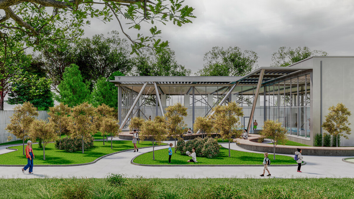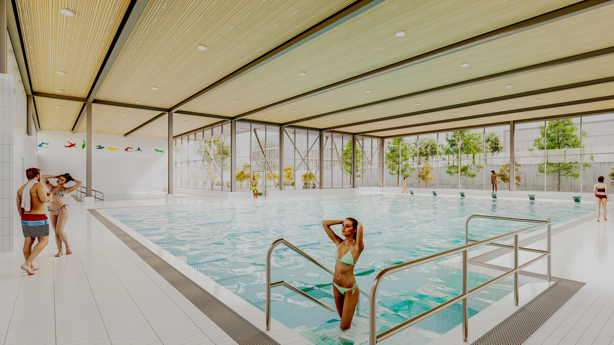 Für den Ersatzneubau wird auf der bestehenden Rasenfläche ein neues Hallenbad geplant, das den heutigen Anforderungen an Funktion, Energieeffizienz und Wirtschaftlichkeit entspricht. Das Gebäude ist klar strukturiert: Der Bereich mit Eingang, Garderoben, Duschen und Nebenräumen bildet einen kompakten Baukörper, an den sich die höhere Schwimmhalle anschliesst.