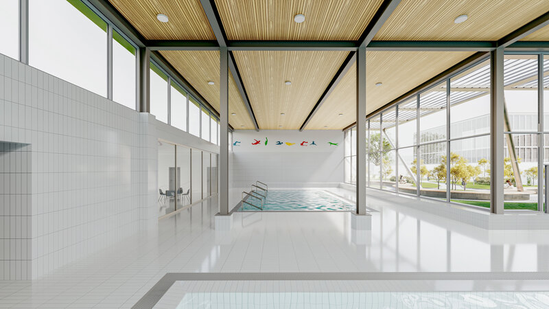 Die Fassade wird als Metallfassade ausgeführt und nimmt in ihrer Farbgebung und Gliederung Bezug auf den Bestand, sodass sich das neue Gebäude harmonisch ins Schulareal einfügt. Die Wärmeversorgung erfolgt über Fernwärme, was einen nachhaltigen und wartungsarmen Betrieb ermöglicht. Ziel des Neubaus ist eine moderne, energieeffiziente und unterhaltsarme Badeanlage mit klaren Strukturen und hoher Aufenthaltsqualität.