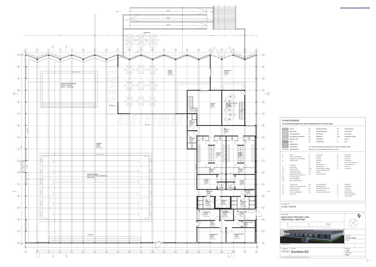 Im Rahmen meiner Diplomarbeit als Techniker HF Hochbau habe ich das Hallenbad Säli in Olten planerisch untersucht. Dabei wurde das bestehende, denkmalgeschützte Hallenbad analysiert und anhand zweier Varianten weiterentwickelt: einer Umbauvariante mit behutsamer Sanierung sowie einem Neubau mit zeitgemässer Architektur und optimierter Nutzung