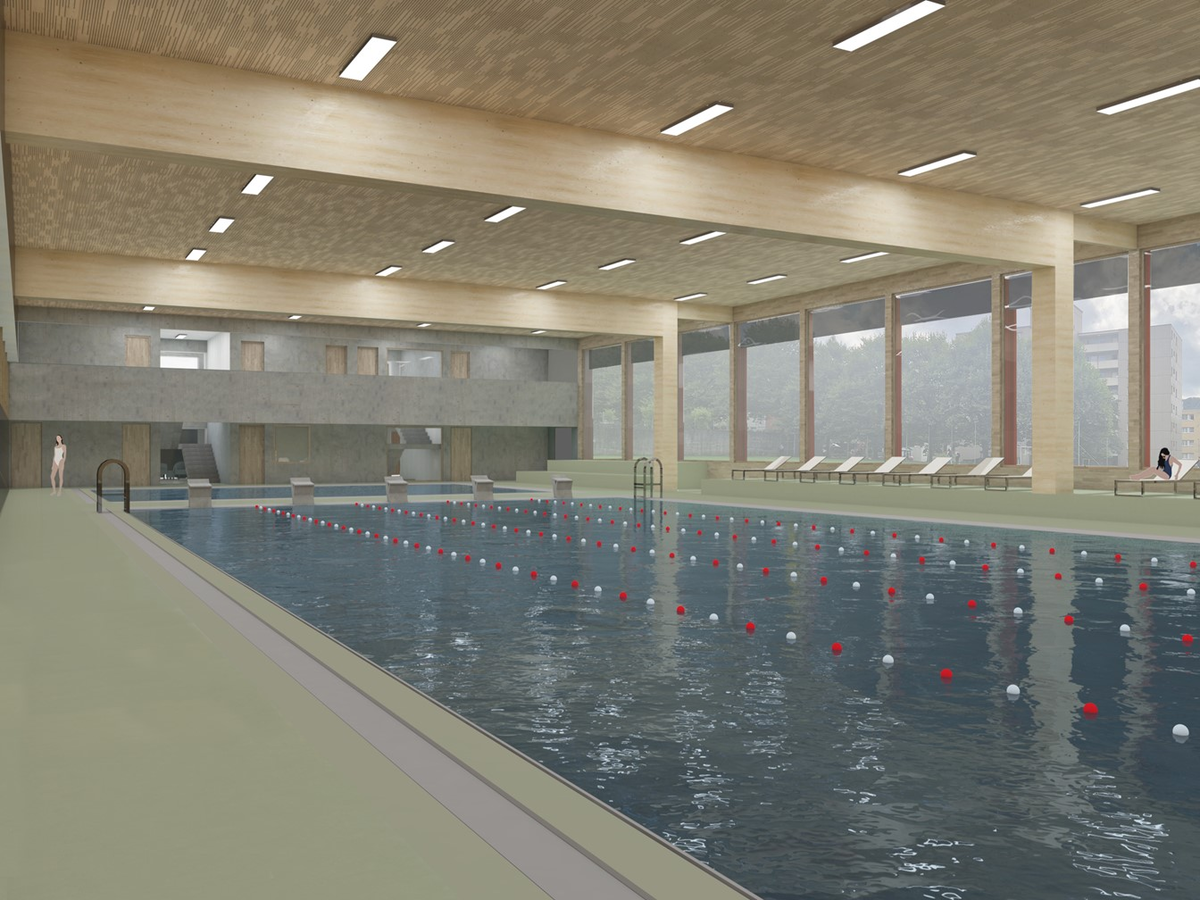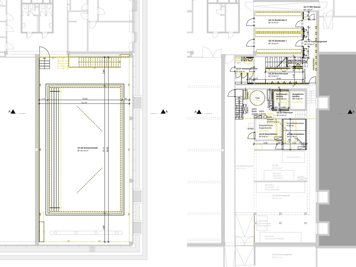 Im Sporttrakt befindet sich eine integrierte Schwimmhalle, die zurzeit mehrere Baumängel aufweist. Unter anderem ein undichtes Schwimmbecken, Nichteinhaltung von Hygienevorschriften, abgenutzte Baumaterialien und eine veraltete Wasseraufbereitungstechnik. Im Rahmen dieser Variante sollen dazugehörende Räume, wie Schwimmhalle, Garderoben, Duschen und WC's saniert werden. Um die Schwimmbadtechnik ersetzen zu können, dürfen die dazugehörenden Technikräumen, unter Einfluss der Gebäudetechnik und neuen Anforderungen, umgebaut werden.