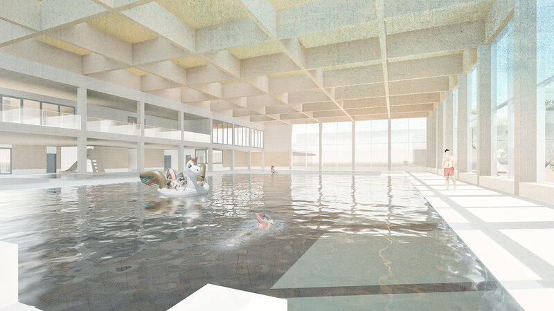 Das Hallenbad ist von der Strasse zugänglich. Die Badehalle ist gegen Südwesten ausgerichtet und beinhaltet ein Schwimmerbecken, ein Nichtschwimmerbecken, eine Planschbecken und ein Sprudelbecken. Um zusätzliche Gäste und somit auch Einnahmequelle zu generieren, ist im Obergeschoss ein Wellnessbereich, ein Fitness und eine Physio geplant. Das Restaurant mit Tribüne, um das Geschehene in der Badehalle zu beobachten, sorgt für Verpflegung und Aufenthaltsmöglichkeit der Gäste.