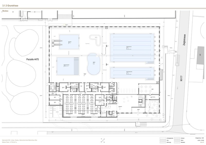 Der Planungsperimeter für den Neubau umfasst ein 4`685m2 ebenes Grundstück, welches an der Nord-West Grenze gegenüber der Strasse erhöht ist. Da das Hallenbad der Öffentlichkeit sowie der Schule dient, war mir die Erschliessung sehr wichtig. Der Eingang für die Öffentlichkeit wollte ich von der Strassenseite gut sichtbar und offen gestalten. Für die Schüler ist seitlich einen separater Eingang angedacht.