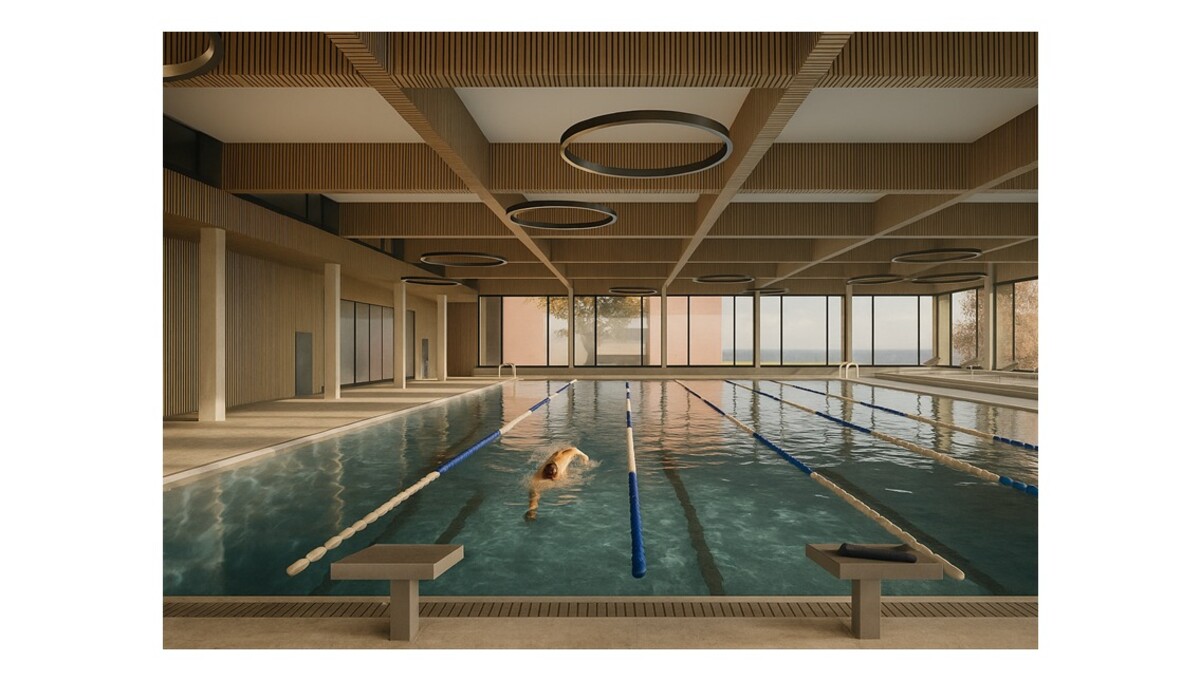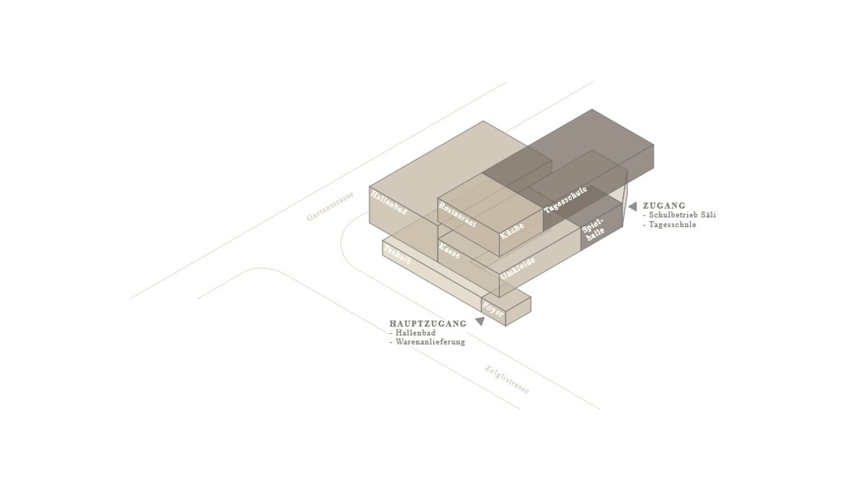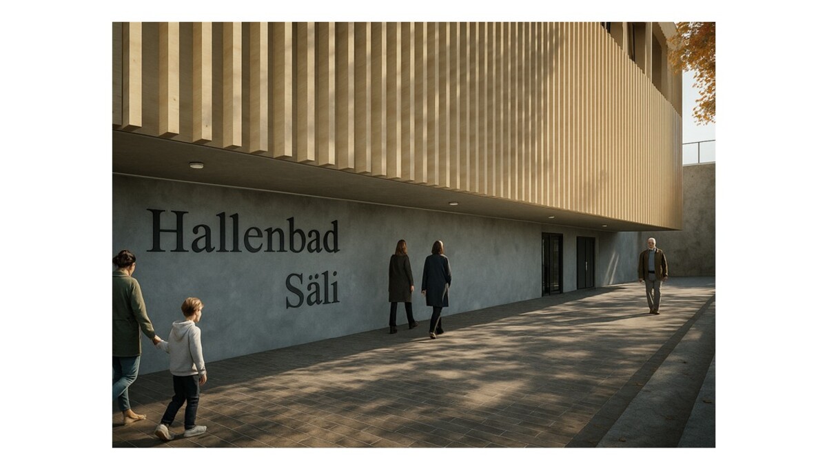 Der Neubau entsteht als freistehender Gebäudekubus in Hybridbauweise: robuste Stahlbetondecken bilden die statische Basis, während die präzise gegliederte Holzfassade den Bezug zur Jurasüdfuss-Architektur stärkt. Im Inneren liegen ein öffentlich zugängliches Hallenbad mit 25-Meter-Becken, Hubboden und separatem Nichtschwimmerbecken sowie eine vollständig integrierte Tagesschule. Diese deckt den von der Stadt Olten definierten Bedarf von 125 Tagesschulplätzen im Einzugsgebiet Säli bis zum Schuljahr 2029/2030.