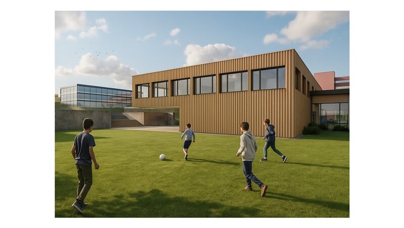 Durch getrennte Eingänge für Öffentlichkeit und Schulkinder wird ein klarer, sicherer Betriebsablauf gewährleistet. Mit einer Bauzeit von rund zwei Jahren kann der Kubus bis Juni 2029 realisiert und pünktlich zum neuen Schuljahr in Betrieb genommen werden. Die bestehende Rasenfläche bleibt grösstenteils erhalten, um den Schülerinnen und Schülern weiterhin ausreichend Aussenraum zu bieten.