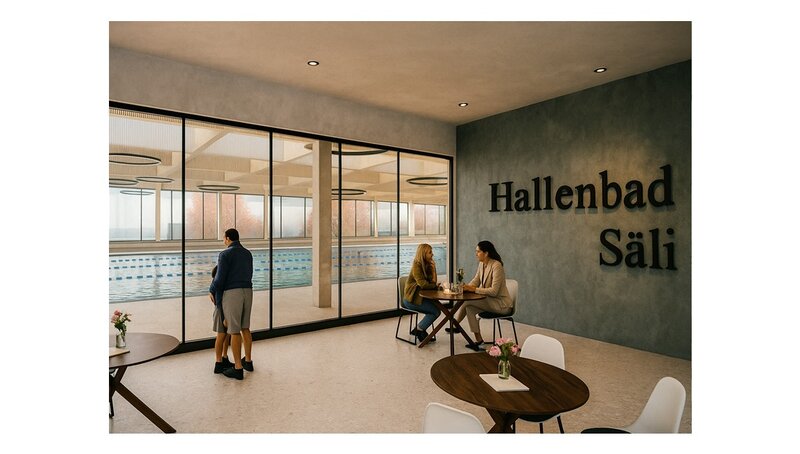 Der Umbau fokussiert SICH darauf, das denkmalgeschützte Hallenbad "SÄLI" technisch und konstruktiv auf den heutigen Stand zu bringen, ohne den Charakter des Gebäudes zu verändern. Zentrale Eingriffe sind die Sanierung des Stahlbetons bis hinter die Karbonisierungsebene, eine neue Abdichtung inklusive Überlauf auf Bodenhöhe sowie der vollständige Ersatz von Sanitär-, Badtechnik- und Innenausbau.