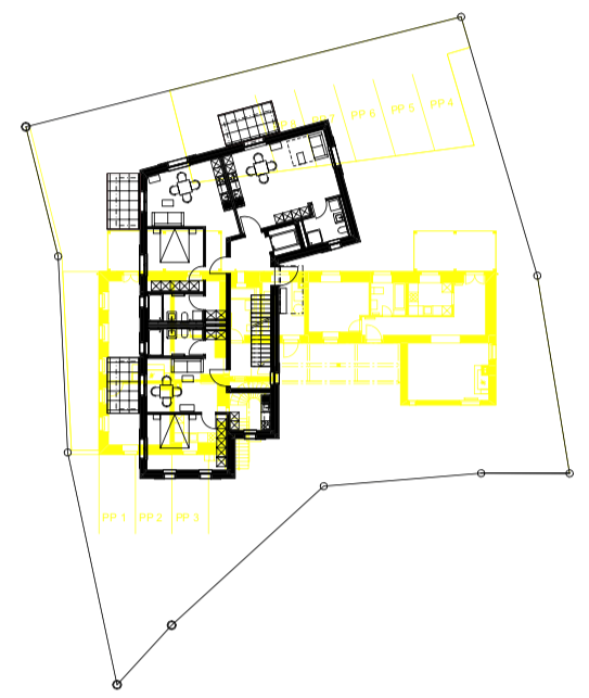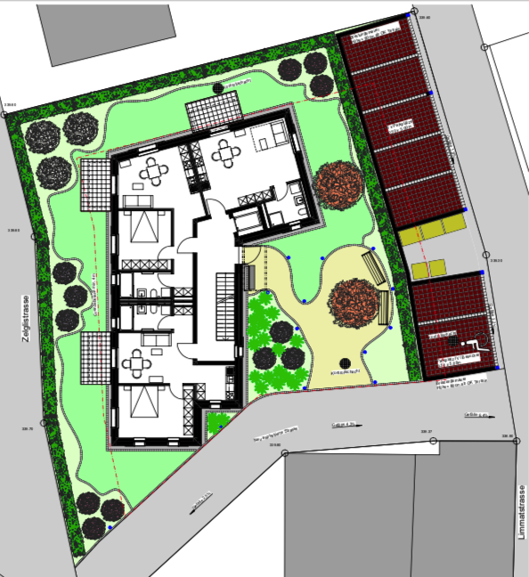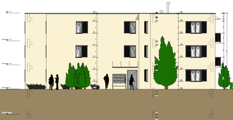 Die Nutzung des Gebäudes wurde durch die Bauherrschaft als Mietwohnungen definiert. Zielgruppe für mich sind alleinstehende Personen sowie Personen in einer Beziehung von Jung bis Alt. Um eine möglichst grosse Vielzahl an vermietbarer Fläche zu generieren entschied ich mich auf Kleinwohnungen von 38 – 51 m2 Grösse. Die Wohnungen im Erdgeschoss bis zum Dachgeschoss sind nach Osten, Süden und Westen gerichtet. Die grösseren Wohnungen bilden die Südfront. Nordwestlich liegt die kleinere 1-Zimmerwohnung. Im Untergeschoss sind die Kellerabteile zu den Wohnungen, Velo-, Technik- und Hauswartraum. Östlich des Grundstücks ist der Zugangsbereich zur Liegenschaft. Nördlich sind Parkplätze vorgesehen.