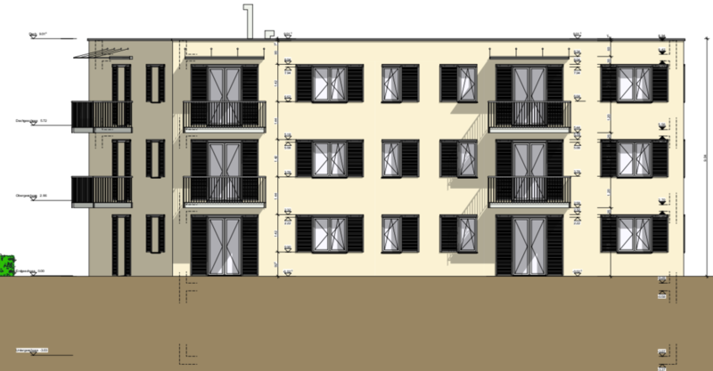 und Fäulnis, dies auch bei andauernder Feuchtigkeit. Zudem bildet sie keinen Nährboden für Ungeziefer. Für den Schallschutz bei Fenster- / Balkontüren wird eine dreifach Verglasung eingebaut. Die Fenster und Balkontüren sind aus Holz-Metall. Die Fensterläden aus Aluminium wirken optisch wie die alten Fensterläden sind aber mittels Schiebefunktion zu schliessen. Die Balkone werden mit einem Zementüberzug im Gefälle auf den Balkonboden ausgebildet. Als Absturzsicherung dienen die Aluminiumgeländer. Die Balkonentwässerung ist eine in den Zementboden eingelegte Rinne. Vordächer sind aus Glas welche mittels Zugstangen rückverankert werden. Infolge der drei Vollgeschosse musste auf ein begehbares Dach verzichtet werden. Der Dachaufbau ist mit einer extensiven Begrünung versehen. Auch hier wurde das Gebäude mit einer Steinwolle gedämmt.