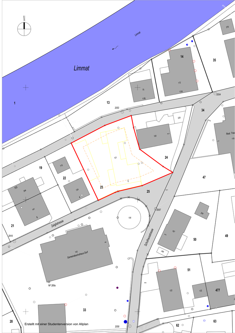 Das Studienobjekt steht in der Gemeinde Turgi im Kanton Aargau. Turgi zählt rund 3000 Einwohner und liegt zwischen Brugg und Baden. Das Mehrfamilienhaus liegt in einem ruhigen Quartier direkt neben der Limmat und dem Grundschulhaus der Gemeinde Turgi. Einkaufsmöglichkeiten, Post, Restaurants und Bahn sind ebenfalls in unmittelbarer Nähe. Die Parzelle Nr. 23 auf der aktuelle Bestandesbau steht, weist eine Grundstücksfläche von ca. 875m2 auf. Das Grundstück ist mehrheitlich eben, wobei der nördliche Teil in Richtung Limmat leicht abfallend ist. Die Parzelle ist mehreckig und auf südöstlicher Seite in einen Spitz verlaufend. Nordseitig grenzt die Parzelle an die Limmatstrasse, die entlang der Limmat verläuft. Auf der Nordseite liegt die Zelglistrasse, an der ebenfalls die Grundschule angrenzend ist.