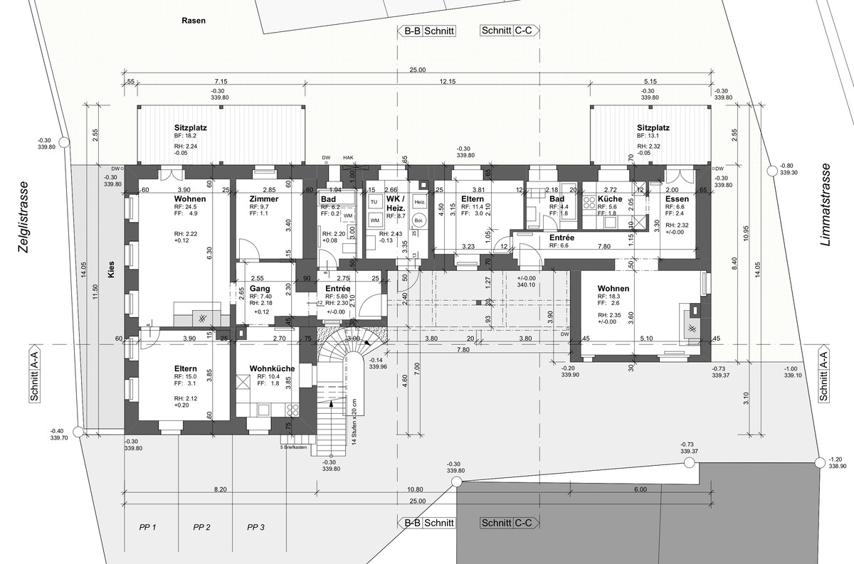 Sitzplätze verwehrt. Der Betonbank auf der Ostseite des Hauses mit einem Ahorn in der Mitte, bietet ein Ort, wo man ein Buch lesen oder auch spannende Gespräche führen kann. Bei der gemeinschaftlichen Grillschale soll der Kontakt der Nachbarn gestärkt werden.