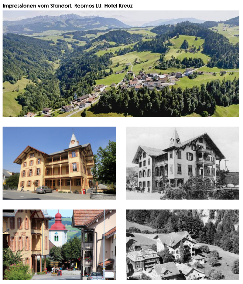Das denkmalgeschützte Hotel Kreuz in Romoos im Kanton Luzern konnte 2006 sein 100-jähriges Jubiläum feiern. Der im schweizerischen Heimatstil erstellte Bau besitzt einen bedeutenden Stellenwert in der kleinen Berggemeinde. Sowohl in gesellschaftlicher, als auch in kultureller Hinsicht dient er seit jeher mit seinen Funktionen und Räumlichkeiten. Im 1. Obergeschoss befindet sich der Kreuzsaal, in dem sämtliche Gemeindeversammlungen der Einwohner, der Kirch- und der Korporationsgemeinde stattfinden. Ebenso führen die ortsansässigen Vereine dort ihre Konzerte und Anlässe durch. Das Restaurant befindet sich im Erdgeschoss und ist der Treffpunkt für Einheimische. Dieses soll unbedingt erhalten bleiben, da es das einzige Restaurant in der Gemeinde ist. Auf der östlichen Seite des Hotels Kreuz, befinden sich ein Schopf und mehrere Aussenparkplätze. An dieser Stelle soll etwas Sinnvolles entstehen, um das Dorfzentrum von Romoos aufzuwerten. Mit den umliegenden Objekten von Schulhaus, Dorfladen, Post, und der katholischen Kirche bilden sie den heutigen Dorfkern.