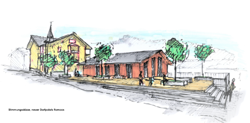 Von Romoos, für Romoos. Die ausgearbeitete Lösung zeigt ein realistischer und funktionierender Weg auf, wie das denkmalgeschützte Hotel Kreuz umgenutzt werden kann. Mit der Wohn- und Restaurantnutzung wird auf die Wünsche der Gemeinde eingegangen. Das neugestaltete und anschauliche Zentrum mit Neubau und Dorfplatz bietet viele neue Möglichkeiten und ist für die Gemeinde eine Chance.