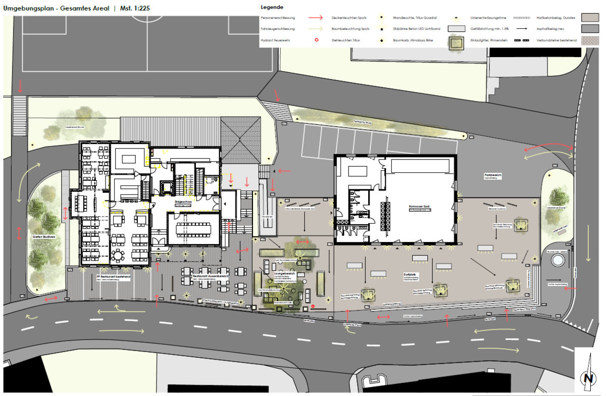 Um den Verlust des Kreuzsaals wieder gut zu kompensieren, wird auf dem ostangrenzenden Grundstück ein neuer Romooser Mehrzwecksaal erstellt. Im neuen Saal können alle möglichen Anlässe für Gemeinde, Vereine und weitere Interessierte stattfinden. Er soll mit dem neu ausgerichteten und klar gestalteten Dorfplatz ein anschauliches Zentrum des Dorfes bilden. Im Innen- und Aussenbereich soll für die Einwohner ein Ort geschaffen werden, an dem Sie sich begegnen und Veranstaltungen durchführen können. Der zweigeschossige Neubau fügt sich ruhig in den Umgebungskontext zwischen ehemaligen Hotel Kreuz und katholischer Kirche ein und stellt sich nicht in den Vordergrund. Unter dem Romooser Saal entsteht ein neuer Technik- und Lagerraum. Es werden neu gedeckte Parkplätze realisiert, die den Wohnungen, dem Restaurant und dem Neubau zur Verfügung stehen.