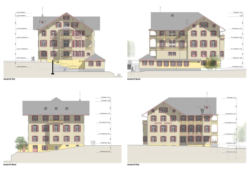 Aus den Studien hat sich ergeben, dass das Hotel Kreuz nicht mehr weiter als Hotel genutzt werden soll. Die in die Jahre gekommenen Hotelzimmer werden in neue und zeitgemässe Wohnungen umgebaut. Es soll Wohnraum für die jüngeren und älteren Einwohner von Romoos geschaffen werden. Der sich im 1. Obergeschoss befindende Kreuzsaal wird ausgelagert und zu modernen Loft - Atelier Wohnungen umgebaut. Das Restaurant im Erdgeschoss bleibt in der gleichen Nutzung bestehen.