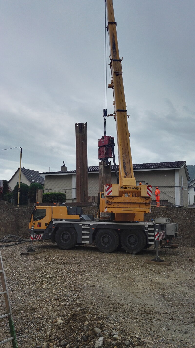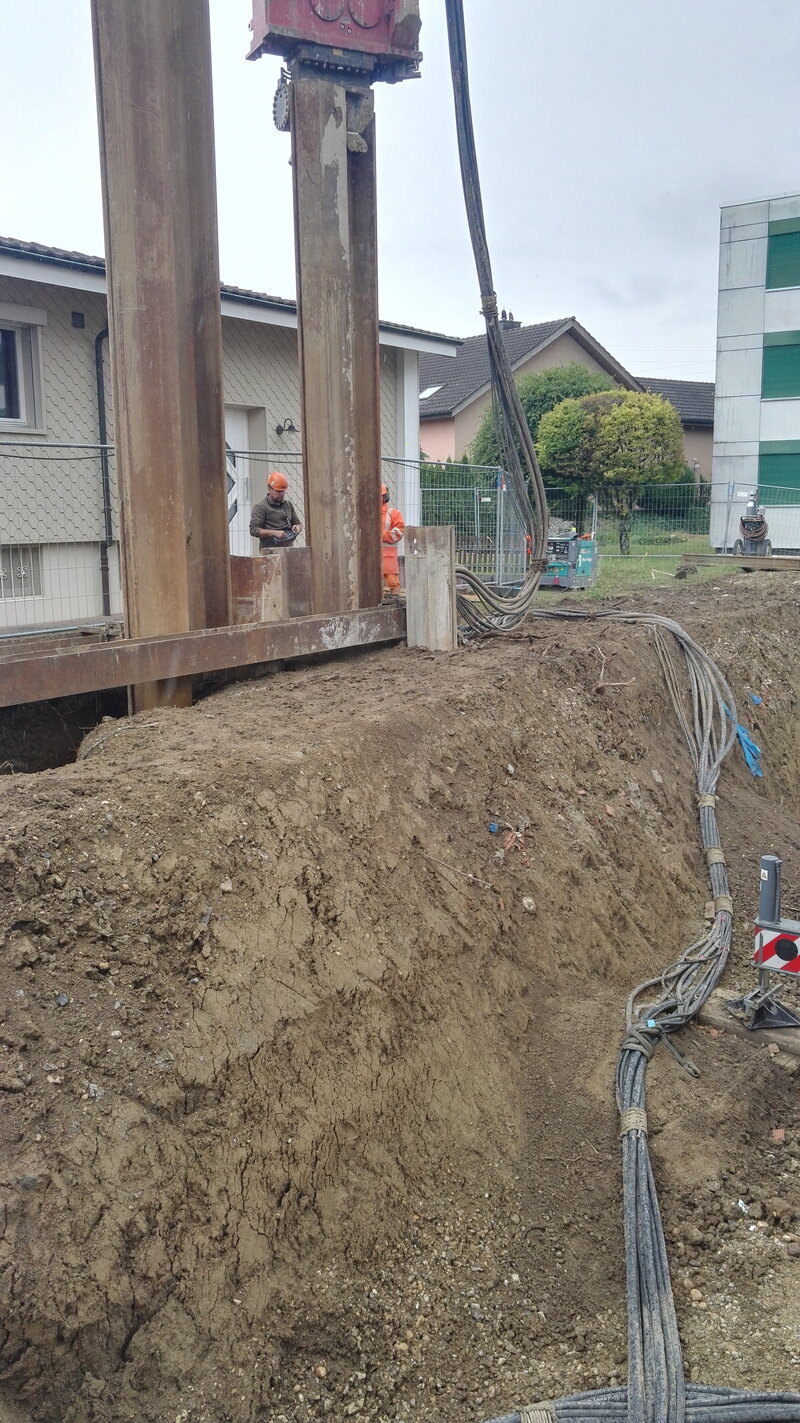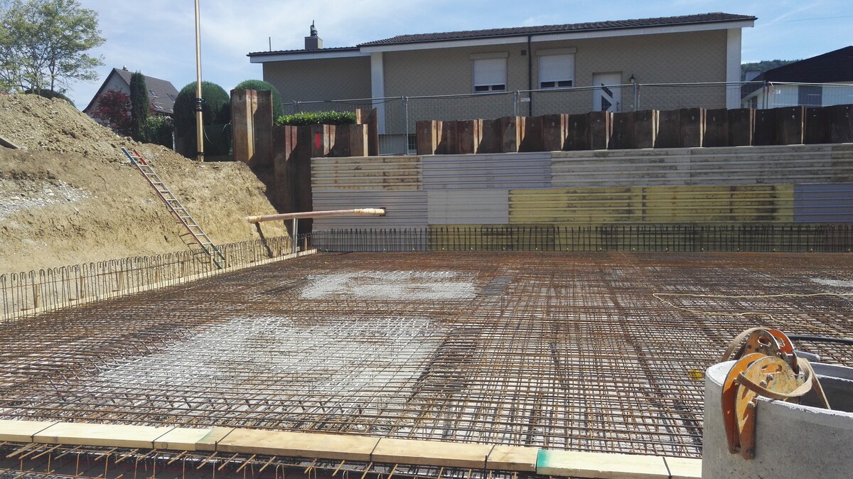 Da die Einstellhalle in einem urbanen Gebiet gebaut wird, gab es Platzprobleme bei der Baugrube. Unter dem angrenzenden Gebäude musste eine Unterfangung geplant werden und für die Baugrubensicherung wurden zwei Varianten erstellt und diese miteinander in Bezug auf die Wirtschaftlichkeit und Machbarkeit verglichen.
