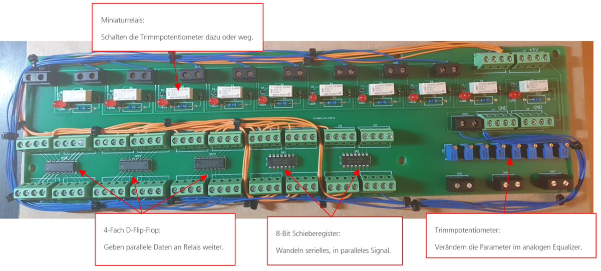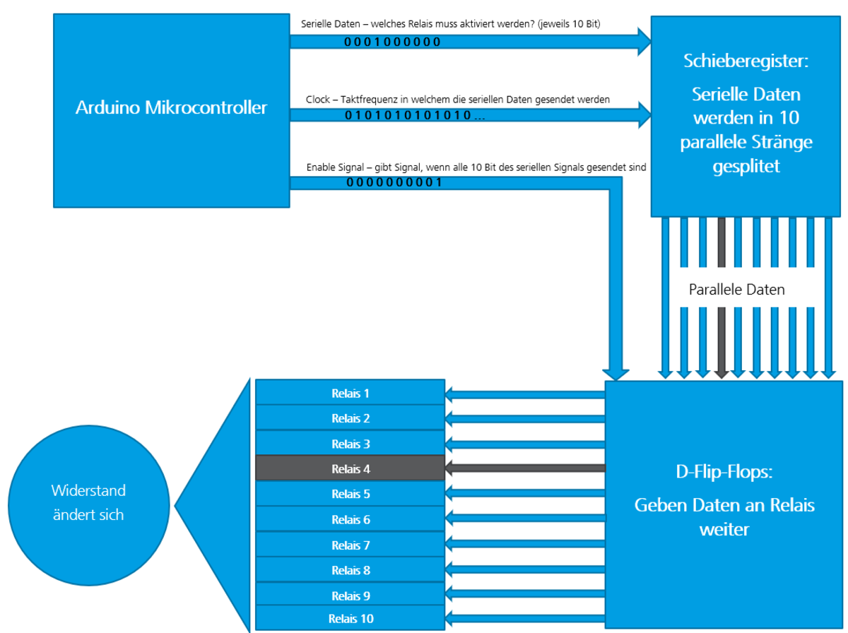 Um die Aufgabenstellung zu erreichen wurde ein Arduino-Mikroprozessor verwendet. Dieser Mikroprozessor sendet ein serielles Datensignal à 10 Bit an eine zu diesem Zweck entwickelte Elektronik-Schaltung (siehe Abbildung 2). Dieses Datensignal wird in dieser Elektronik mithilfe von Schieberegistern und D-Flip-Flops in ein paralleles Datensignal verarbeitet und an 10 Miniaturrelais gesendet. Je nachdem welches Datenbit im seriellen Signal als logisch «1» gesendet wird, bringt das entsprechende Relais dazu seine Spule anzuziehen und somit einen Schliesser-Kontakt zu betätigen. Dieser Schliesser im Relais schaltet dann Widerstände in der Elektronik dazu bzw. ab. Die Widerstände ersetzen dann im Audio-Equalizer direkt die Drehpotentiometer, und verändern so dessen Parameter. Zur visuellen Veranschaulichung der Ablaufs siehe Abbildung 1.