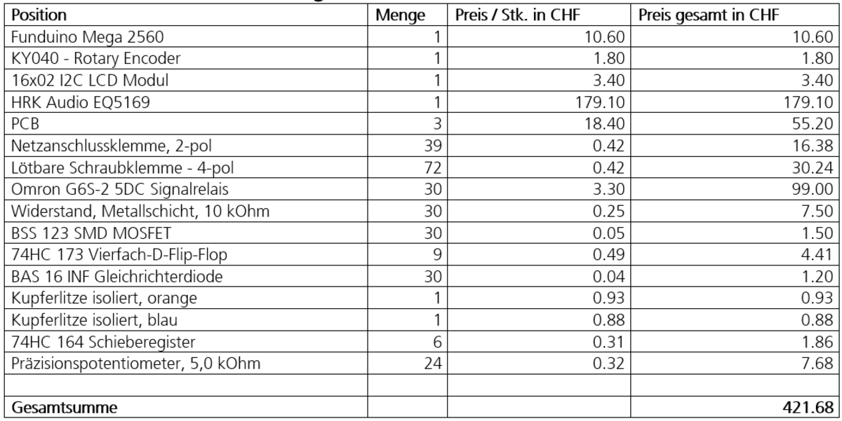 Die Material Kosten für das gesamte Gerät belaufen sich dabei auf rund 420.- CHF (siehe Abbildung 4: Kostenzusammenstellung). Dies inkludiert natürlich die Anschaffung eines Equalizers. Das ausgearbeitete Konzept lässt sich natürlich auch ganz einfach in anderen Audio-Geräte, oder jedes andere Gerät implementieren, die ihre Parameter über Drehpotentiometer manipulieren. Diese Arbeit setzt also erst den Grundbaustein für ein Konzept, welches in viele weitere Richtungen ausgearbeitet werden kann.