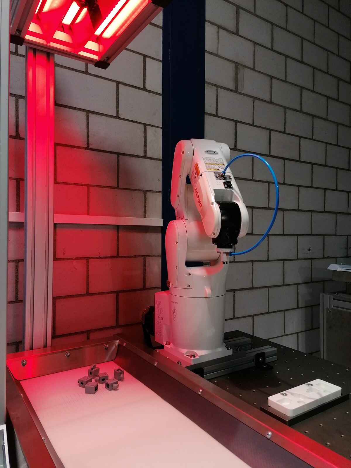 Das Programm ist produktunabhängig und kann, solange es sich um einen DENSO Roboter und eine Cognex Kamera handelt, auch für ein anderes Setup verwendet werden. Einzig im Kameraprogramm muss das neue Produkt eingelernt und eventuell ein anderer Vakuumgreifer entwickelt werden.