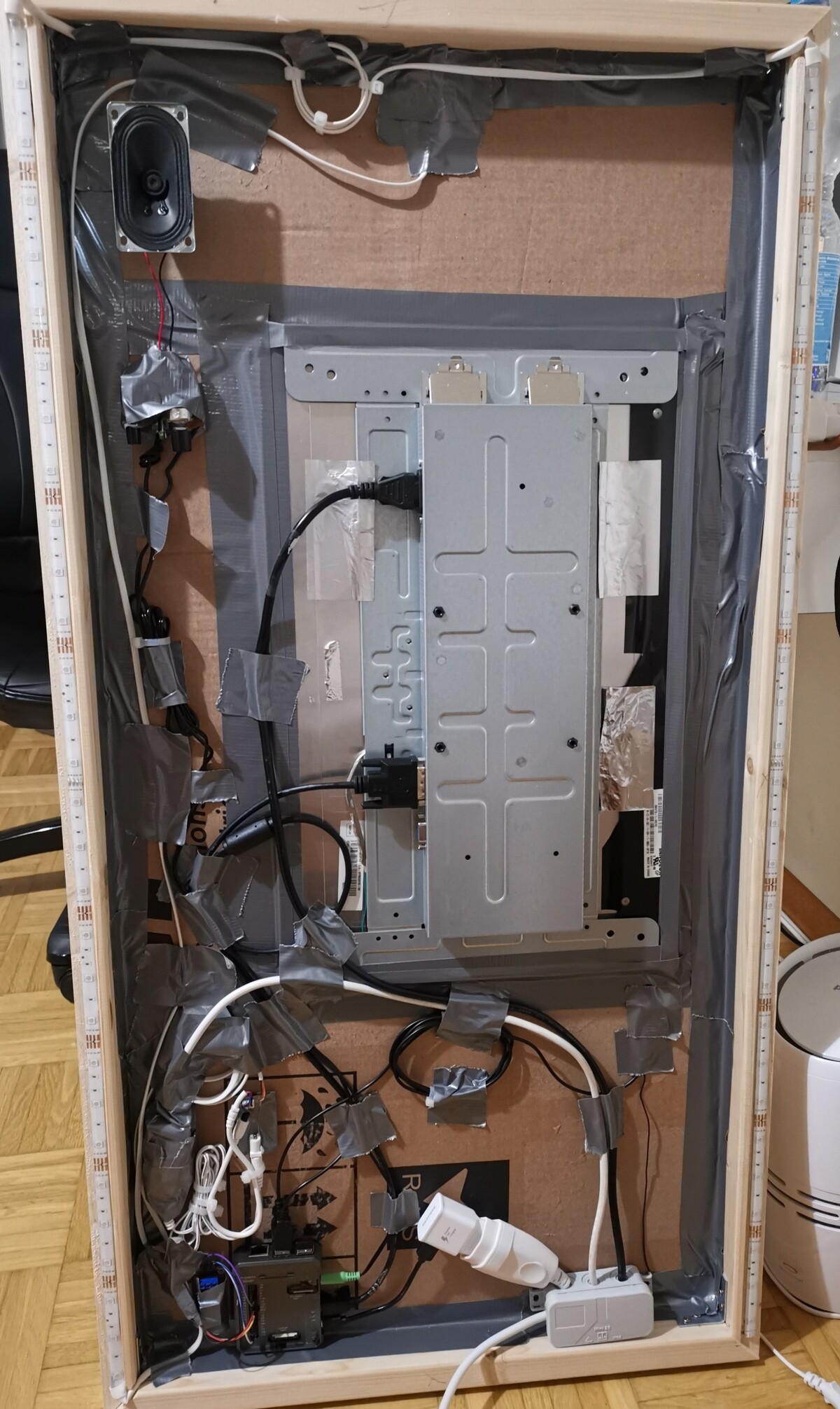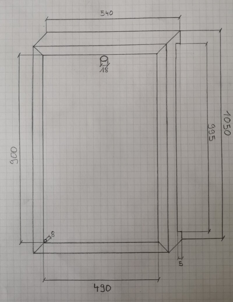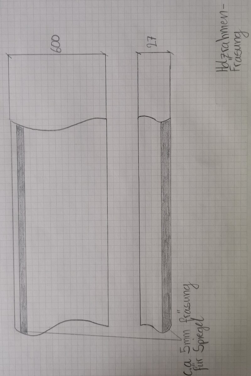 Bezüglich den Spiegel habe ich mich für ein 2WayMirror Acrylglas entschieden, welcher über Einfräsungen im Rahmen befestigt wird.