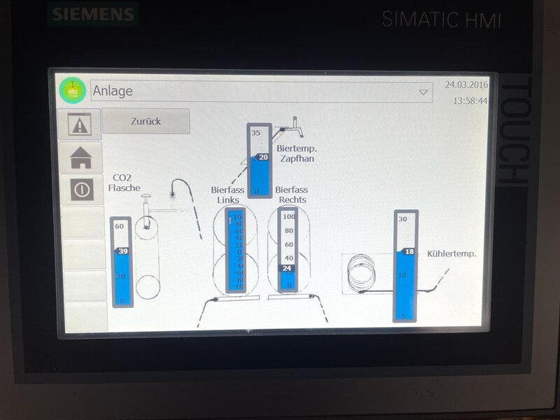 Diese Systemkonfiguration, bestehend aus Touchdisplay und SPS, erlaubt beispielsweise, abhängig von der Jahreszeit die Temperatur der Getränke richtig einzustellen. Es gibt drei Temperaturzustände der Anlage: Sommer, Winter und Zwischensaison. Diese werden über das HMI gesteuert. Die Temperatursteuerung erfolgt über einen Zweipunktregler. Als weitere Zusatzfunktion wird zur Anlagenüberwachung mittels Gewichtssensoren festgestellt, wieviel Bier noch in den Fässern ist. Dieser Füllstand kann über das Touchdisplay abgerufen werden. Die CO2-Flasche wird mittels Drucksensor überwacht.
