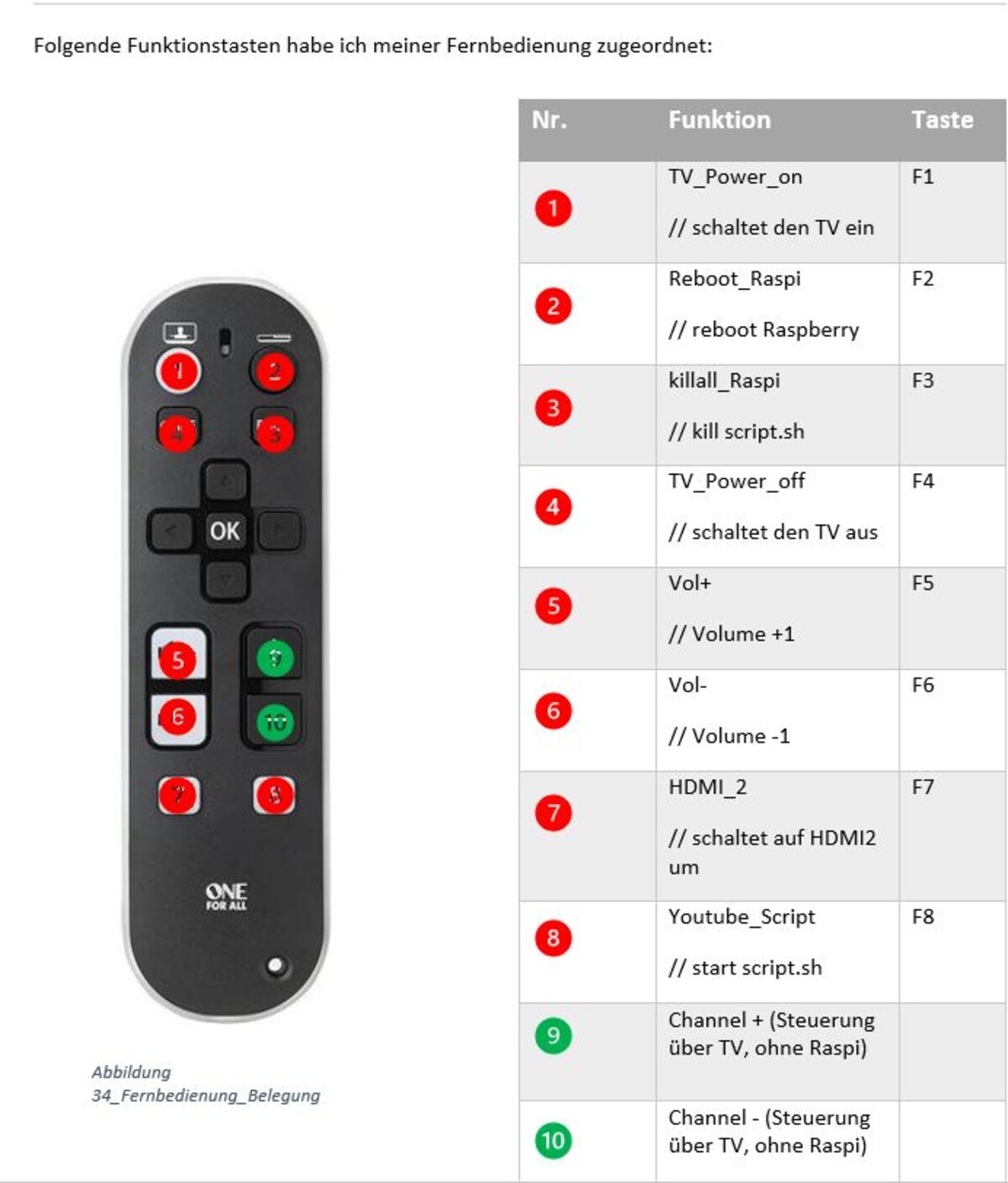Der Kunde kann meine MultimediaZentrale am bestehenden TV anschliessen. Das Einzige, was er benötigt, ist ein aktuelles Fernsehgerät sowie einen Internet-Anschluss. Mittels Fernbedienung (10 Tasten wurden programmiert) ist es dem Kunden möglich, mit nur einem Tastendruck ein von mir vorgegebenes YouTube-Video abzuspielen. Der Link zum YouTube-Video kann jederzeit mit minimalem Aufwand geändert werden - auch mittels Fernzugriff- und dies weltweit. Möglich macht dies ein Script, welches ich für den Raspberry eingerichtet habe. Das Script wird bei Tastendruck aktiviert und ist grob nach folgendem Muster aufgebaut: