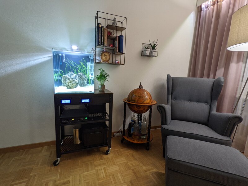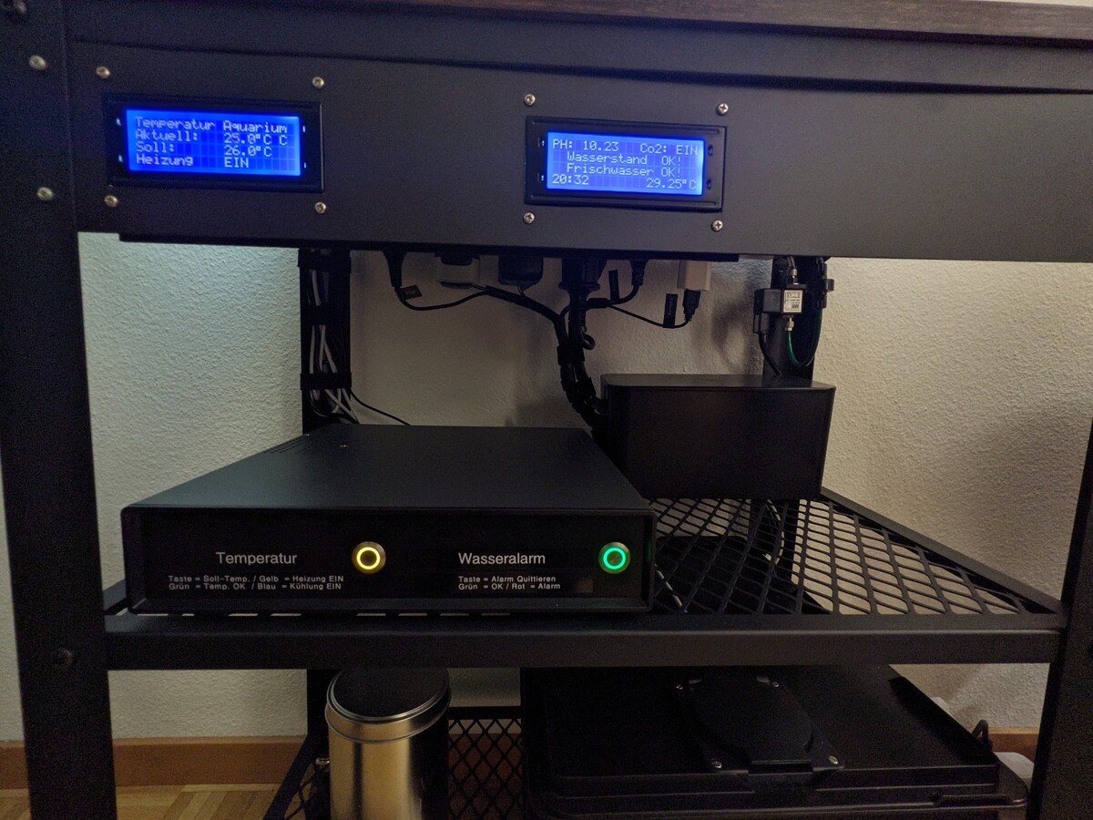 Die Aquaristik ist bekanntlich ein aufwendiges Hobby. Es ist konstant das Gleichgewicht zwischen Wasser, Leben und Pflanzen, in einem begrenzten Raum zu halten. Im Gegenzug ist das zu sehende Resultat, eines funktionierenden Aquariums eine dankbare Ernte. Unbewusst viel Zeit brauchen schon grundlegende Vorgänge am Aquarium wie die Temperaturkontrolle, PH-Wert-Überwachung, CO2 Zugabe und Beleuchtungsbedienung. Hinzu kommen die Gedanken, wenn man im Bett liegt und etwas tropfen hört, ob es das Aquarium sein könnte. Ich habe es mir zur Aufgabe gemacht, ein Aquarium zu stellen, welches diese Vorgänge automatisch erledigt. Stösst dieses an seine Grenzen, gibt es Hinweise in Form von Anzeigen oder Alarmen ab. Zum Beispiel um den Frischwassertank nachzufüllen oder einen Wasseralarm zu beheben.