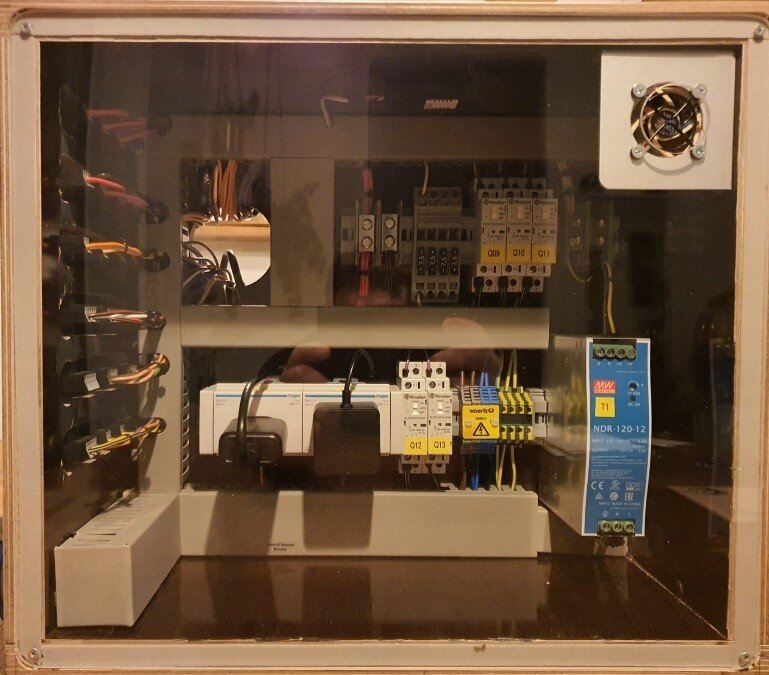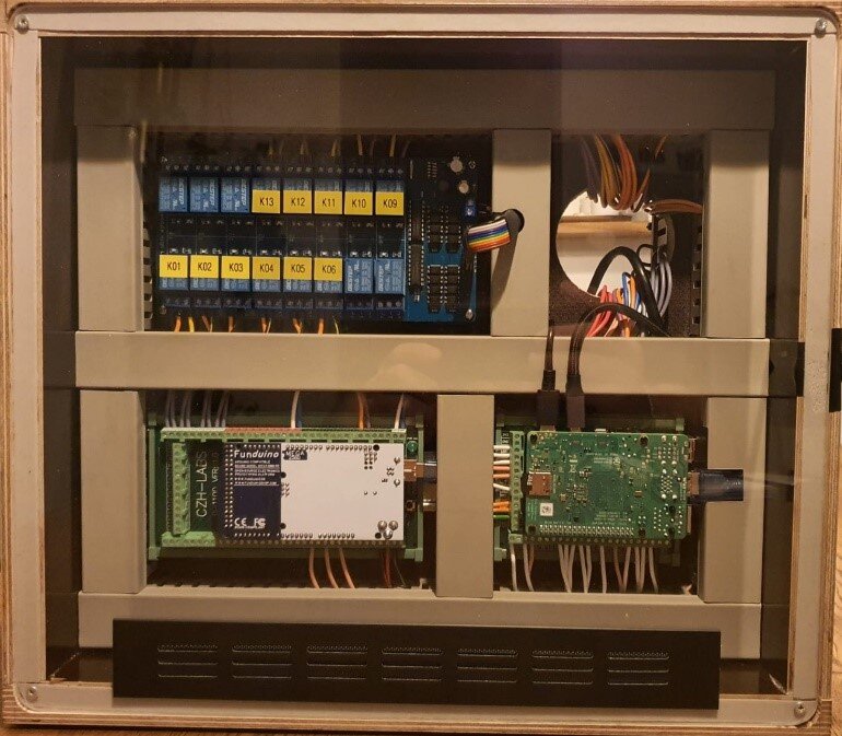 Die intelligente Steuerung wird aus einem Arduino Mega 2560 und einem Raspberry Pi 4 gebildet. Der Arduino liest die verbauten Sensoren aus und übermittelt die Messwerte an den Raspberry Pi. Dieser steuert je nach gemessenem Wert die Aktoren über Relais und / oder Installationsschütze. Schwellwerte können hinterlegt und laufend angepasst werden, welche definieren, wann die Aktoren ein- und ausschalten sollen. Nebst dem automatischen Betrieb können alle Aktoren über verbaute Drucktaster manuell gesteuert werden.