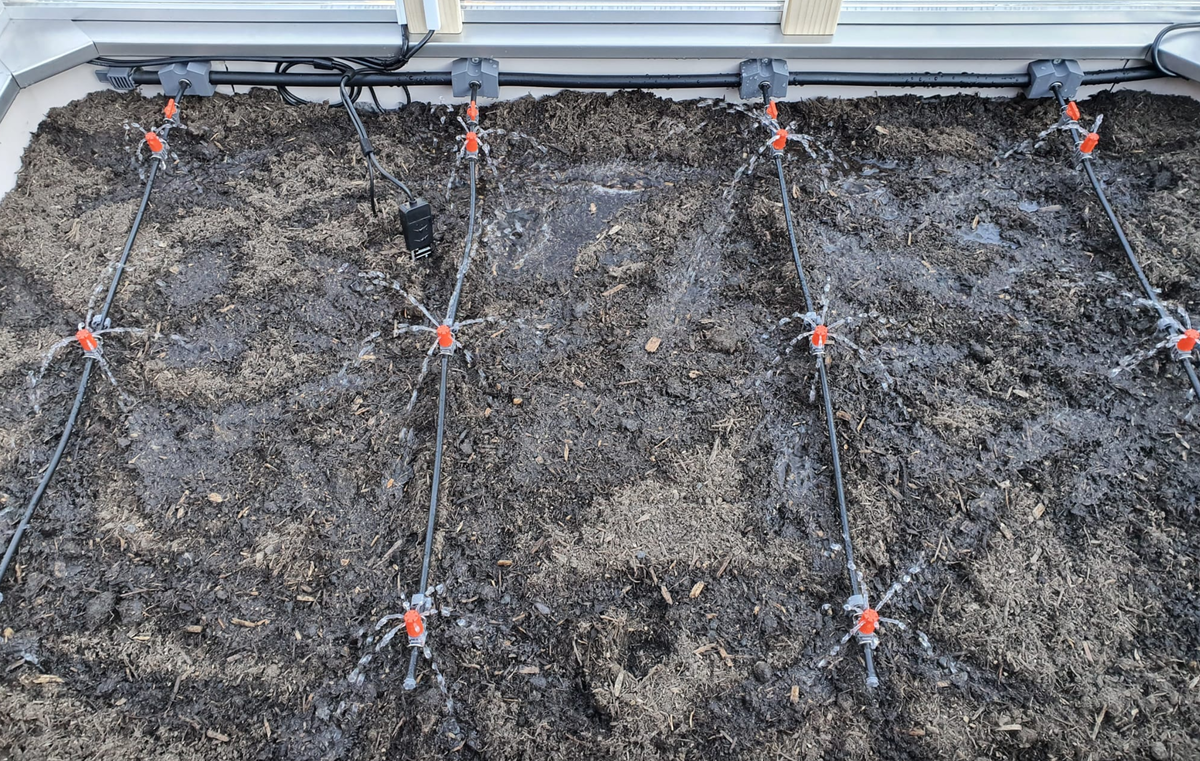 Das gewählte Bewässerungssystem "Micro-Drip-System" des Herstellers Gardena kann individuell auf den aktuellen Gemüseanbau angepasst werden, denn deren Position, sowie die Wassermenge der gewählten Sprüher, kann problemlos verändert werden. Ein Bodenfeuchtesensor steuert den automatischen Bewässerungsprozess. Mit Hilfe einer 12V Druckwasserpumpe und einem 125 Liter Wassertank ist es möglich das Beet über 5 Wochen hinweg ohne zusätzliche Tankfüllung zu bewässern.