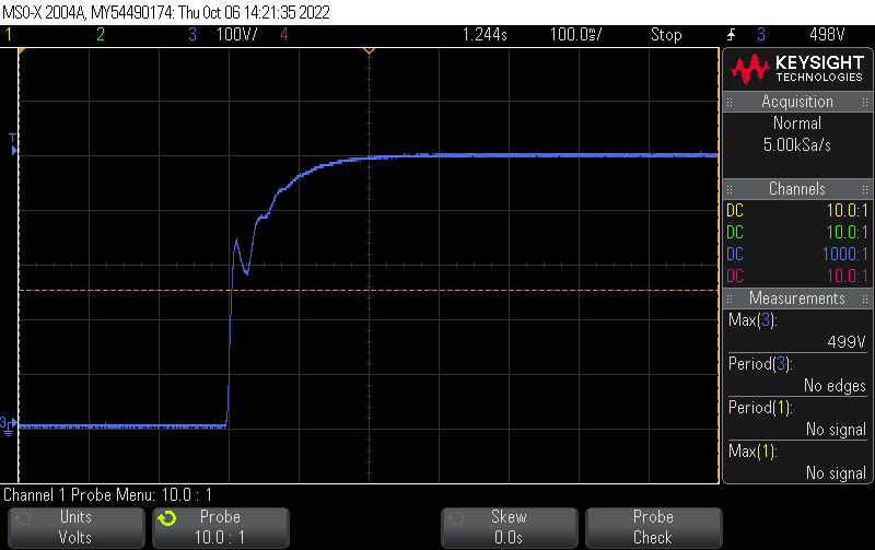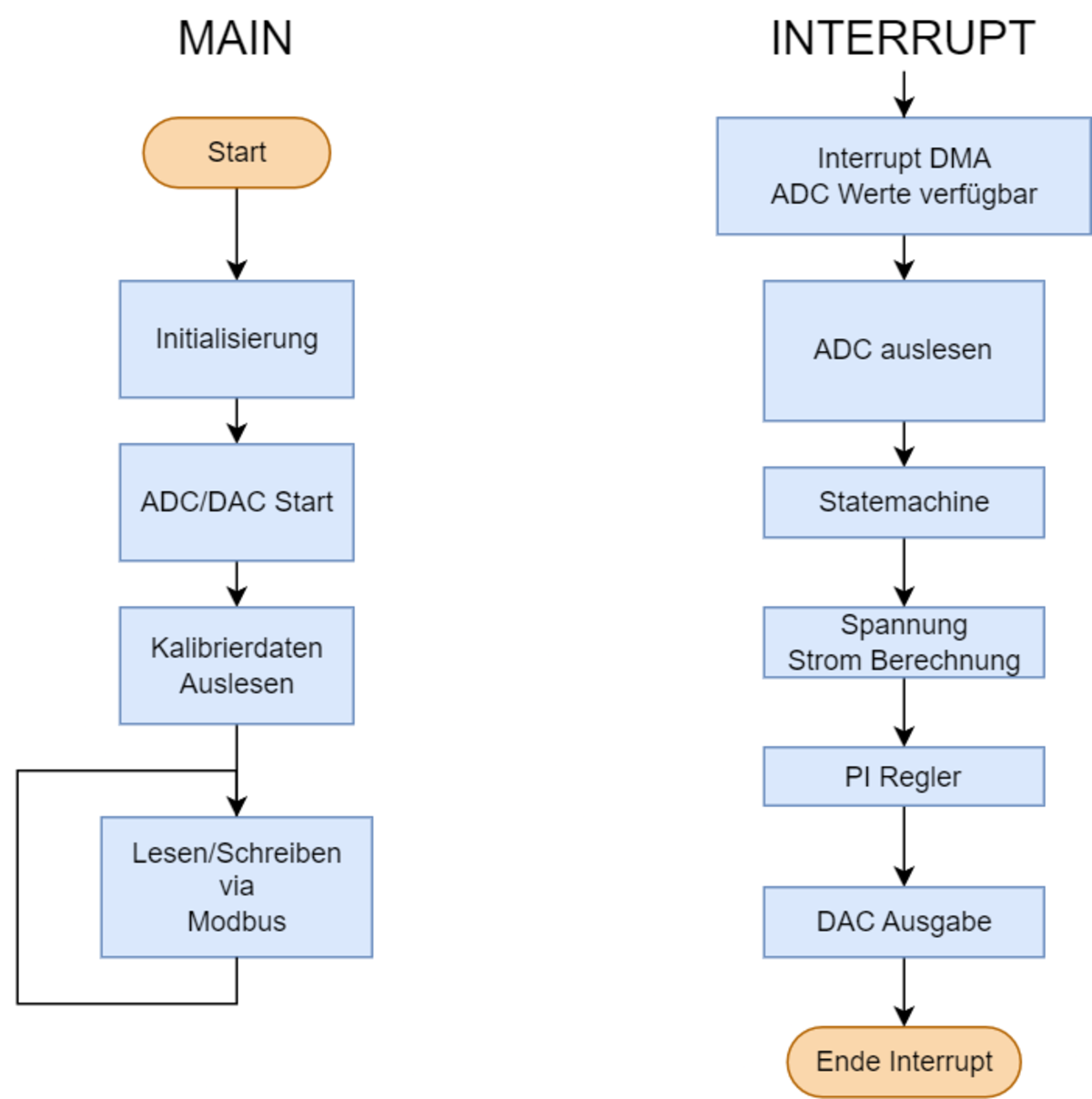 Da die Spannung am Hochspanungsmodul sehr lastabhängig ist, muss die Spannung nachgeregelt werden. Dazu wird ein PI-Regler eingesetzt. Durch die gemessenen ADC-Werte kann die SOLL / IST Differenz berechnet und über den DAC-Ausgang nachgeregelt werden.
