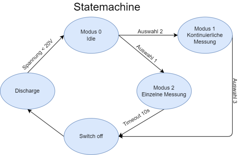 Beim gewählten Konzept, wird die Hochspannung mit einem HV/DC Modul umgesetzt. Die galvanische Trennung wird über den AC/DC Wandler realisiert. Mit einem Spannungsteiler und dem internen ADC des Mikrocontrollers, wird der Leckstrom sowie die Prüfsspannung über dem Prüfling gemessen.Somit kann der Isolationswiderstand bestimmt werden. Ein DAC wird auf das HV/DC Modul zurückgekoppelt um die Spannung zu reglulieren.