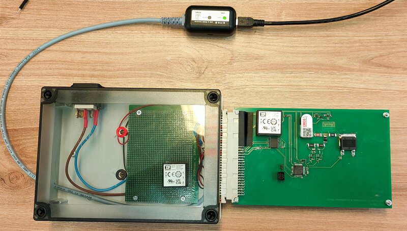 Für die Präsentation wurde eine Anschlussbox gebaut, welche die Backplane simulieren soll. Die Speisung sowie die Prüfspannung wurden herausgeführt, um ein Testobjekt anschliessen zu können.
