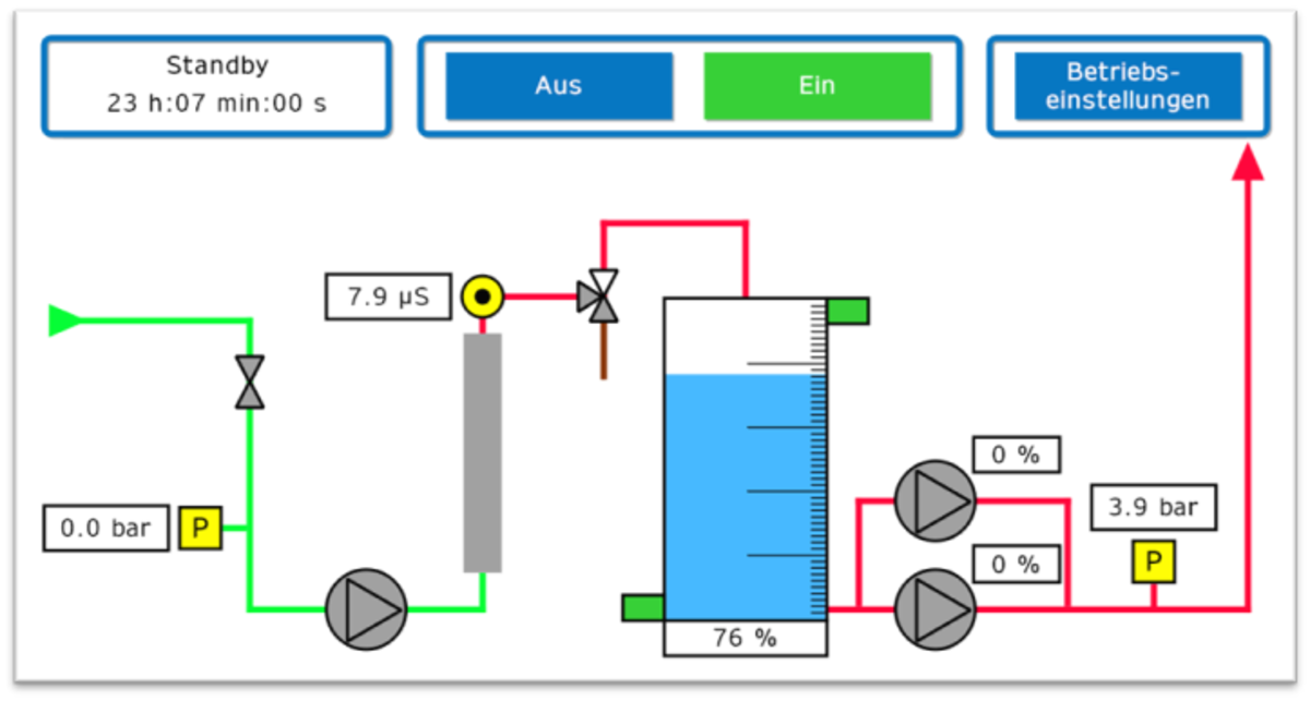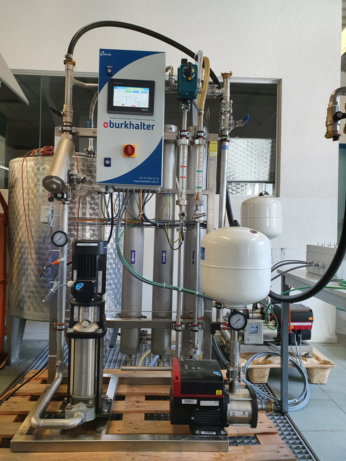Das Eingangsventil der Anlage geht auf und die Permeatoren (Edelstahlrohre im Hintergrund, Bild Testanlage) werden mit Leitungsdruck gespült. Dasselbe geschieht im Anschluss nochmals, aber dieses mal mit eingeschalteter Druckpumpe, bis die Leitfähigkeit des Wassers den gewünschten Grenzwert unterschreitet. Das Wasser wird danach in den Tank produziert und über die Druckpumpen (hinten rechts, Bild Testanlage) an den Kunden weitergeben.