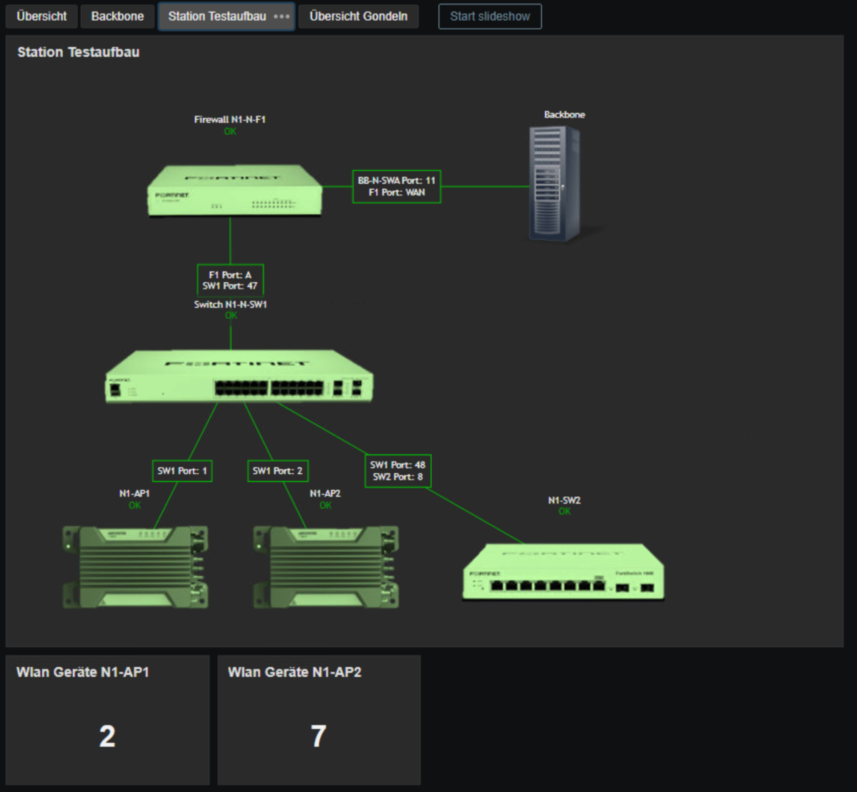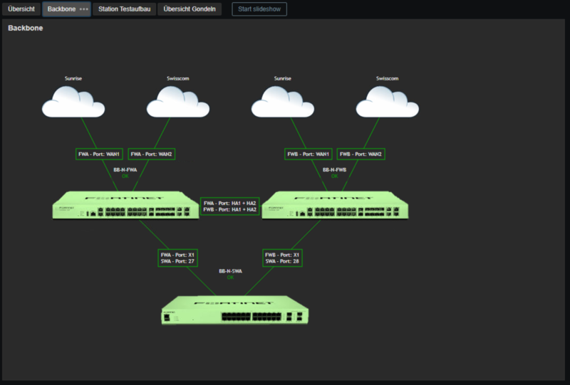 Mithilfe der Informationen wurden 6 Übersichtskarten (Dashboards) erstellt. Diese zeigen an, ob alles in Ordnung ist oder ob Fehler bzw. Störungen vorhanden sind. Wenn eine Störung entsteht, werden diese protokolliert und eine Meldung wird als E-Mail versendet. Die Dashboards wurden so aufgeteilt, dass man zu Beginn eine Übersicht über das komplette System erhält, welche Backbone-Netz, Station und Gondeln beinhaltet. Dann erhält man auf den nächsten drei Seiten Detailinformationen zu den drei Teilsystemen. Bei der Übersicht Firewall kann man die CPU Auslastung, der aktuell belegte Speicher, sowie die Seriennummer und die aktuelle Version herauslesen. Bei den Switchen erhält man Informationen zu den einzelnen Ports.