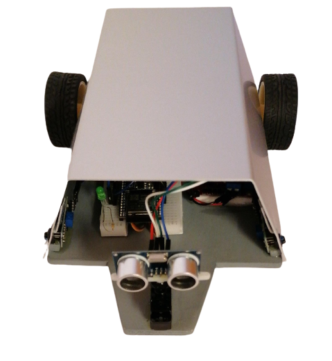 Vorne ist der Servomotor mit dem Ultraschallsensor. Während das Fahrzeug sich bewegt, checkt der Ultraschallsensor fortlaufend die Umgebung und sendet Schallwellen aus. Bei einem Hindernis prallen die Schallwellen zurück und treffen beim Empfänger wieder ein. Mittels ESP32 wird das Signal in einen Befehl umgewandelt und an den Motorentreiber weitergesendet. Dieser wandelt den Befehl wieder um und die DC - Motoren erhalten ihren entsprechenden Befehl. Die ganze Steuerung wird mittels Powerbank betrieben. Die Infrarotsensoren auf beiden Seiten sind eine zusätzliche Sicherheitsmassnahme, damit das Fahrzeug nicht mit Hindernissen kollidiert.