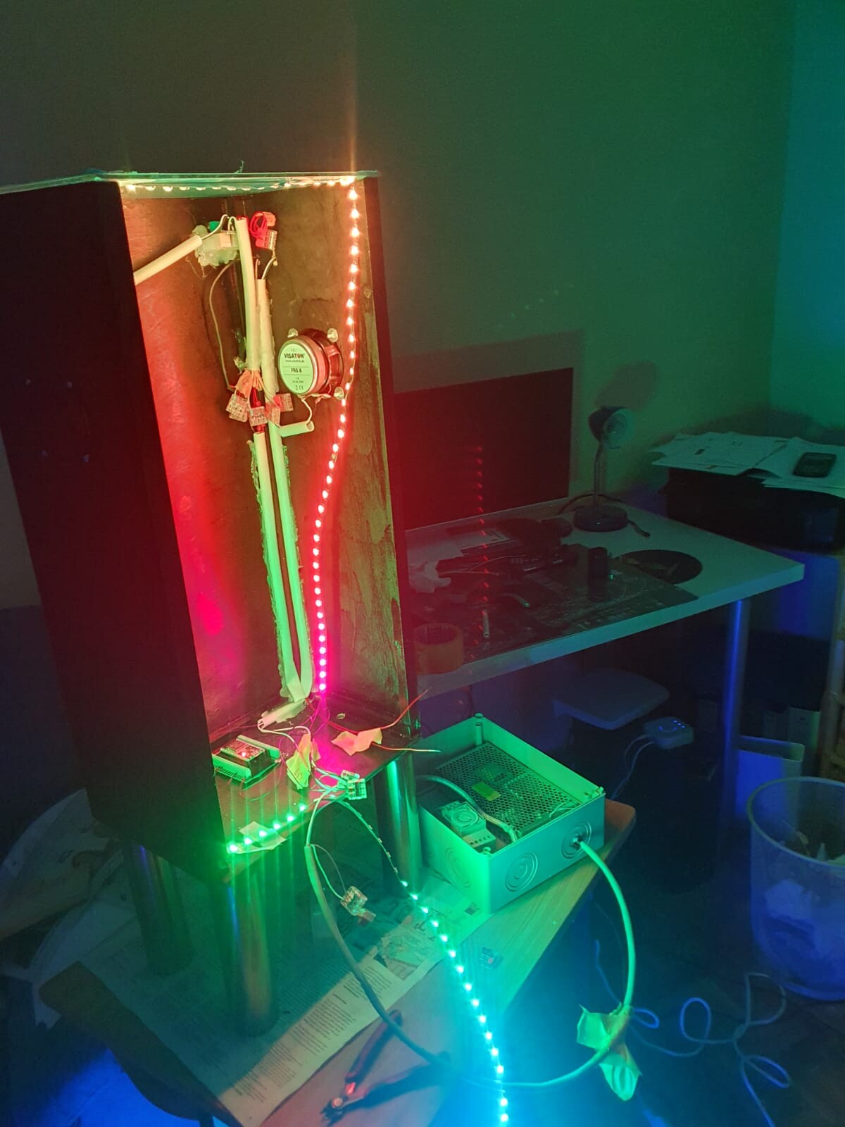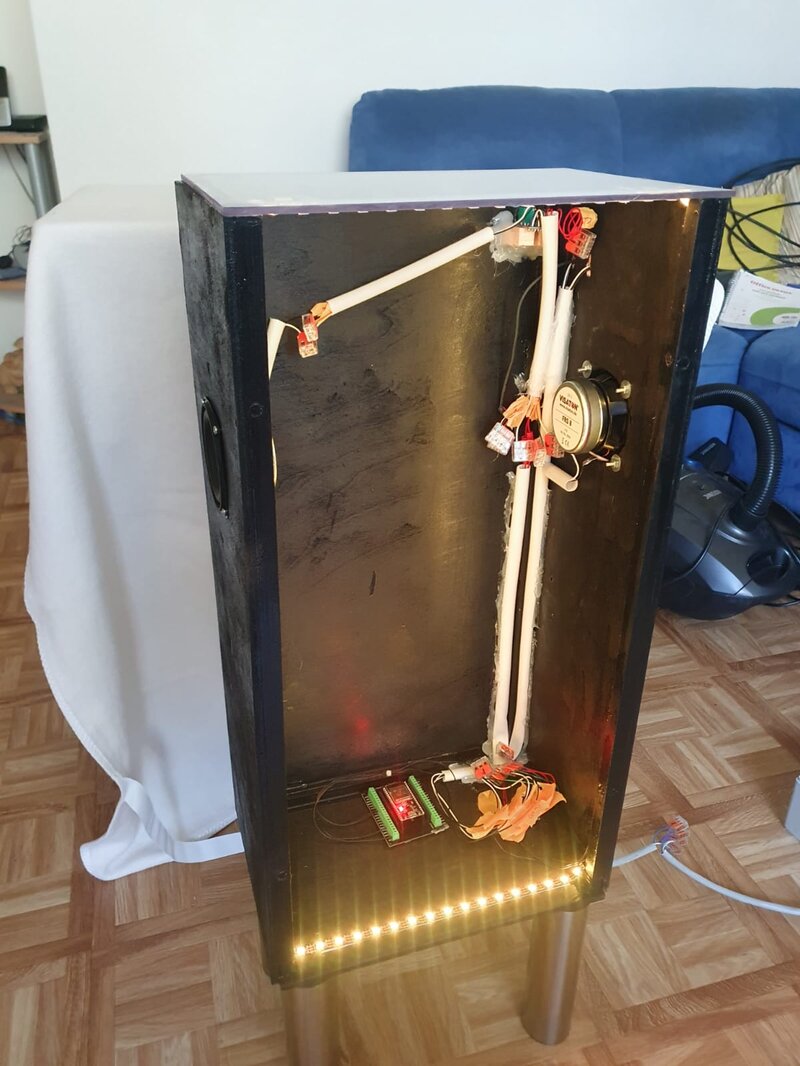 Die Lichtsteuerung erfolgt mithilfe eines Microcontrollers (ESP Wroom 32). Zum Ein- und Ausschalten der LEDs sowie zum Wechseln der verschiedenen Lichtmuster wird eine IR-Fernbedienung verwendet. Zusätzlich wird ein Dämmerungssensor eingesetzt, um die Helligkeit zu regulieren. Für die Audiowiedergabe werden zwei Lautsprecher benötigt. Diese werden durch ein TPA3116D2 Class D Verstärkermodul gesteuert, das über einen Lautstärkeregler verfügt und die Audiosignale verstärkt. Die gesamte Anlage verfügt über ein AUX-Kabel, das an ein Handy oder MP3-Gerät angeschlossen werden kann, um Musik in Ruhe geniessen zu können.