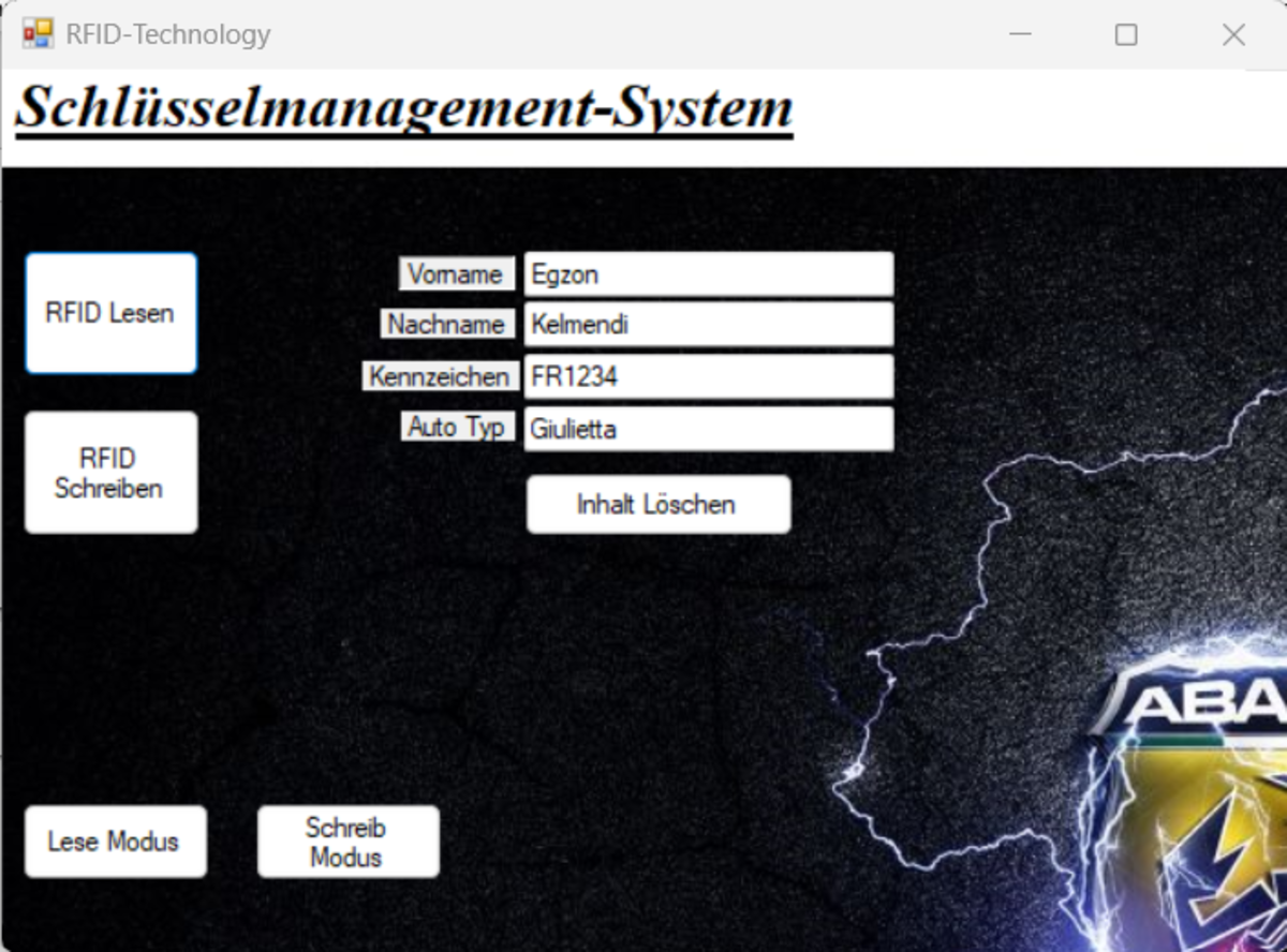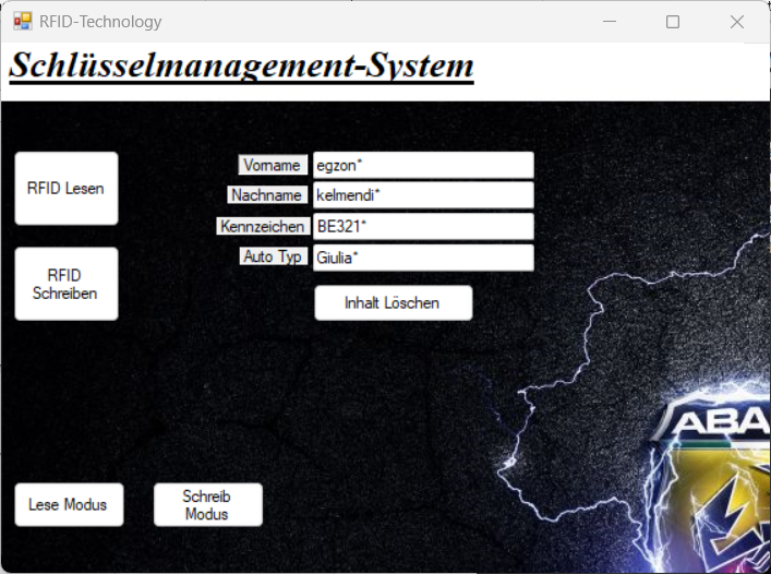 Das Lesegerät, wie in Bild 1 unten zu sehen ist, wird neben der Schlüsselkiste im Geschäft platziert, um Zeit zu sparen. Wenn ein neuer Schlüssel hinzugefügt wird, wird ein bestehendes RFID-Tag am Autoschlüssel angebracht. Um dieses RFID-Tag zu beschreiben, legt man es auf die Lesefläche, und der Beschreibungsprozess beginnt. Zuerst wechselt man in den Schreibmodus und trägt dann die Informationen in die Labels ein, wobei am Ende ein Sternsymbol hinzugefügt werden muss. Nach Abschluss des Schreibvorgangs muss die RFID-Schreibschaltfläche betätigt werden, um die Daten auf dem RFID-Tag zu speichern. Auf diese Weise wird das RFID-Tag beschrieben, und man kann seine Arbeit fortsetzen. Die Daten können zu einem späteren Zeitpunkt erneut ausgelesen werden. Wenn man die gespeicherten Daten lesen möchte, wechselt man zuerst in den Lesemodus, legt dann einfach das RFID-Tag erneut auf die Lesefläche und betätigt die Leseschaltfläche, um die Daten auf der Benutzeroberfläche unter dem entsprechenden Label anzuzeigen.