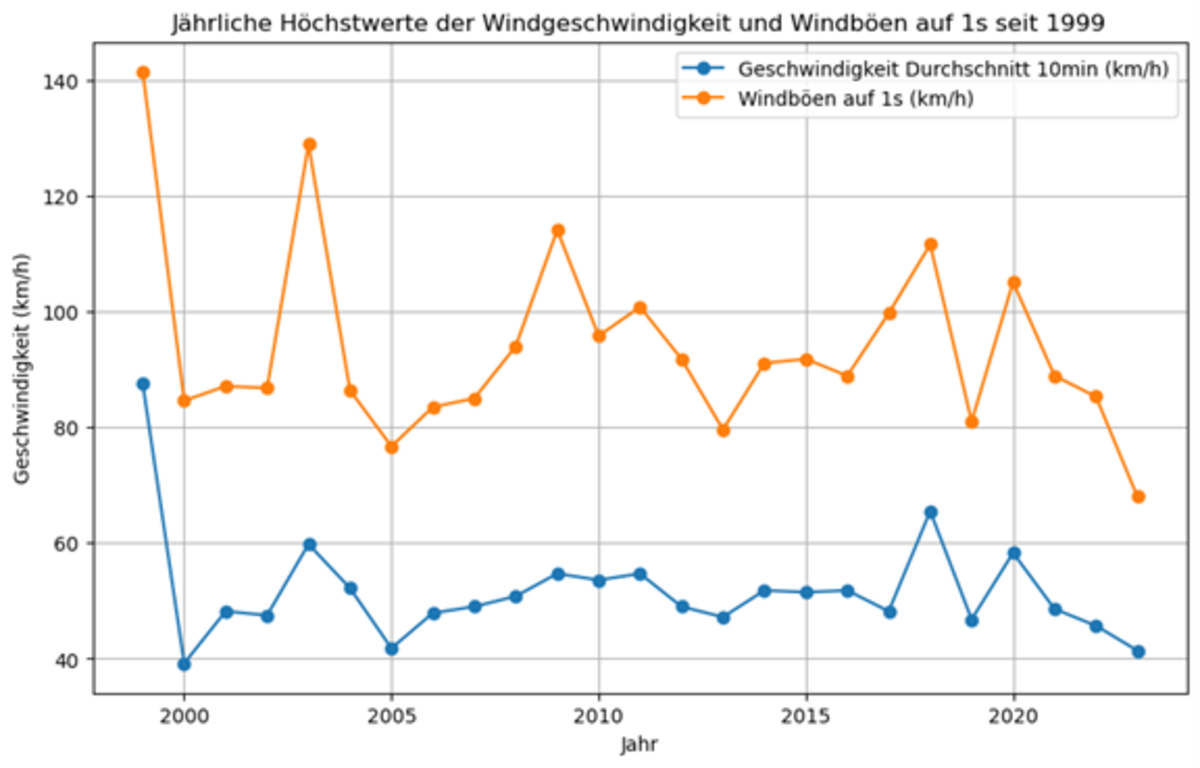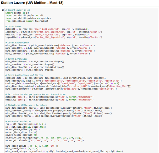 Für das Projekt wurden Wetterdaten von verschiedenen Orten wie Luzern, Cham und Mosen gesammelt. Diese Daten stammten von MeteoSwiss. Mithilfe der Programmiersprache Python und spezifischen Bibliotheken wie Pandas und Matplotlib wurde die Datenanalyse und -Visualisierung durchgeführt. Dies ermöglichte ein tieferes Verständnis dafür, wie der Wind die Leitungen an verschiedenen Standorten beeinflusst.
