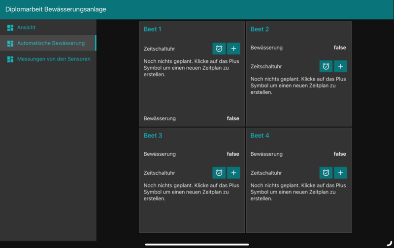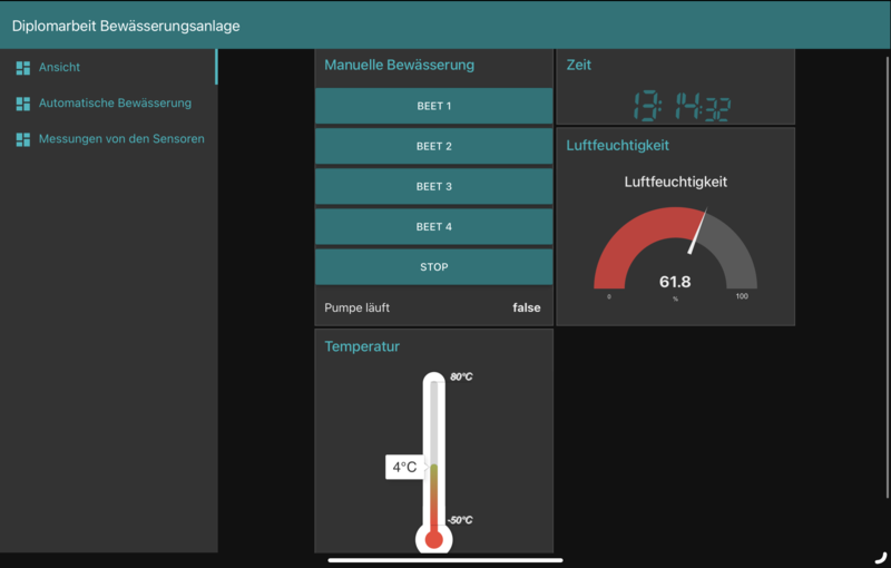 Auf der Visualisierung kann die gesamte Anlage einfach bedient und überwacht werden. Es können verschiedene Bewässerungsvorgänge ausgeführt werden. Bei Ferienabwesenheit kann die Anlage auch aus der Ferne via Smartphone gesteuert werden.