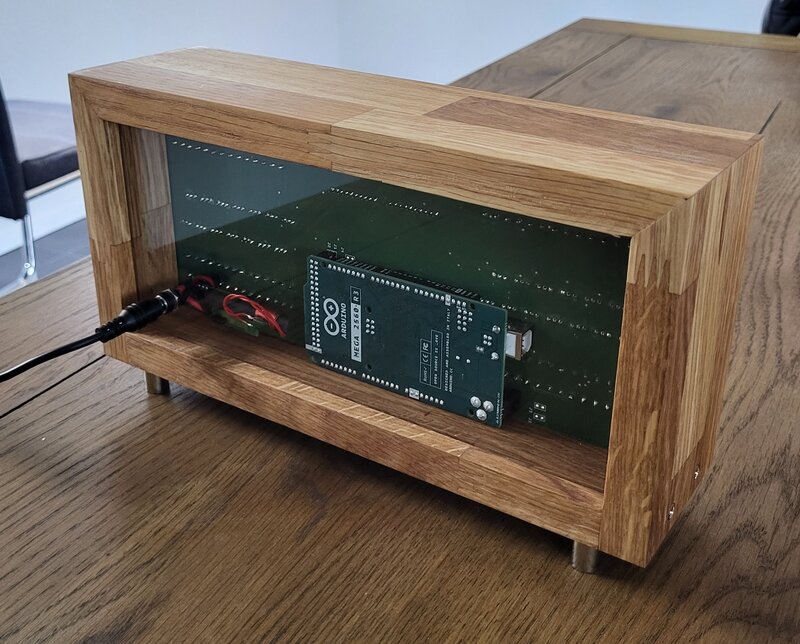 Ziel Das Ziel meiner Diplomarbeit ist es, eine Funkgesteuerte Digitaluhr zu bauen und zu programmieren. Als Funksignal wird mir der DCF77-Zeitzeichensender in Mainflingen, Deutschland, dienen. Das Funksignal wird von einem DCF77-Empfängermodul empfangen und durch einen verbundenen Mikrocontroller, das Arduino Mega 2560 Rev. 3, ausgewertet. Die ausgewertete Zeit wir durch das Arduino auf vier 7-Segment-Anzeigen ausgegeben. Realisierung Zu Beginn der Arbeit wurden verschiedene Varianten erarbeitet. Diese Varianten wurden mit der Recherche kombiniert und untereinander verglichen. Zur Auswahl standen zum Beispiel die Variante der Zeithaltung mittels einer zusätzlichen Real-Time-Clock und der Ausgabe über einen kleineren Mikrocontroller mit dem Multiplexing-Verfahren. Diese Möglichkeiten wurden miteinander verglichen und es wurde die Zeithaltung durch die konstante Abfrage der Uhrzeit über das Funksignal und die Ausgabe über die einzelnen Pins des Arduino gewählt. Um diese Komponenten miteinander zu verbinden, wurde ein Schema in der Design-Software "Fritzing" erstellt. diese Software erlaubt es, ein Schema zu zeichnen und direkt daraus eine Leiterplatine, kurz PCB, zu erstellen. Um die Funktion des Schemas zu prüfen, wurde ein Prototyp gelötet, der nach den Tests mit dem programmierten Arduino als PCB bestellt werden konnte. Das PCB konnte gelötet werden und nach dessen Test musste noch ein Gehäuse für die Uhr gebaut werden. Das Gehäuse wurde aus Holz gefertigt und das PCB kann in das Gehäuse eingeschoben werden. Als Front- und Rückenabdeckung wurde Acrylglas gewählt, um den Berührungsschutz sicherzustellen und den Einblick in die Elektronik nicht zu beeinträchtigen.