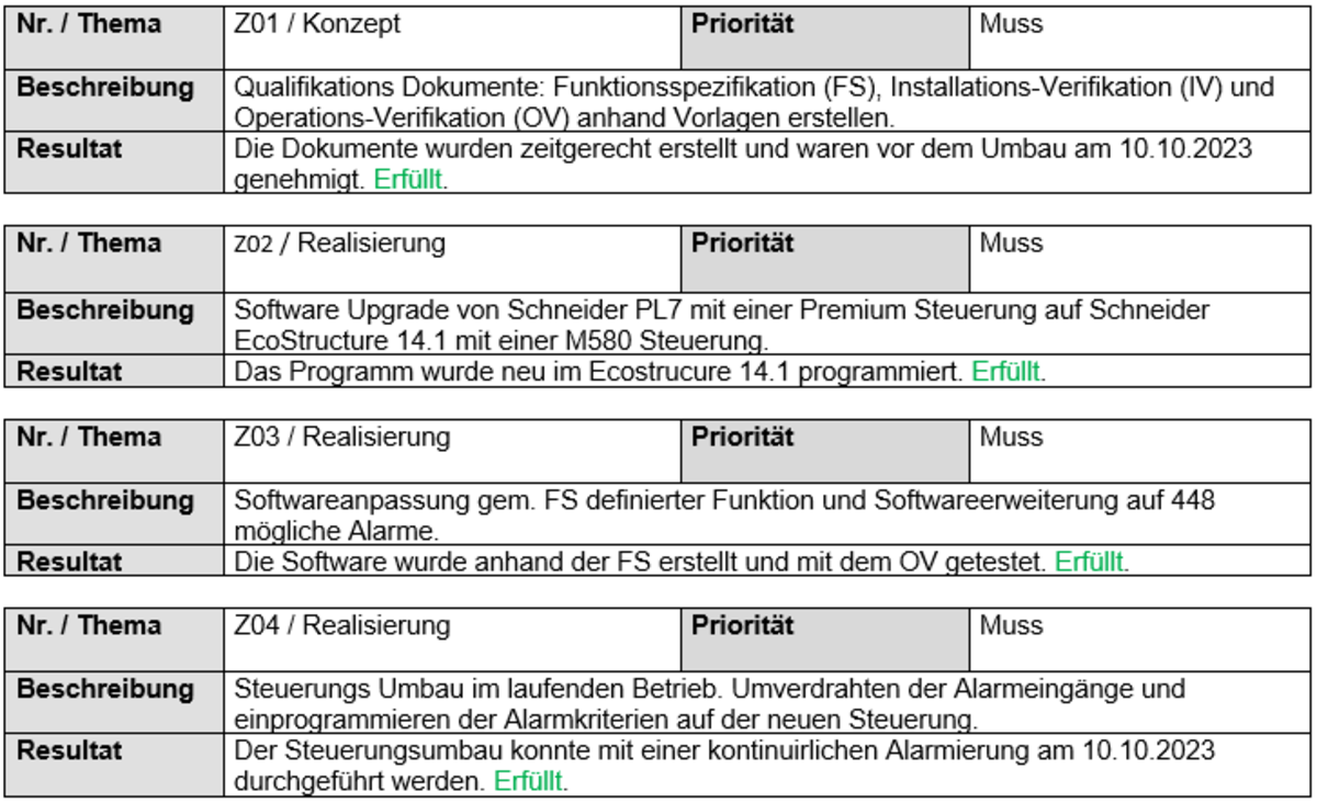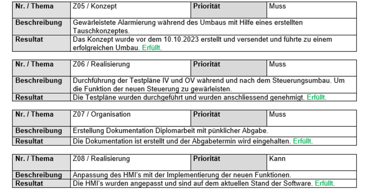 Abschluss Die Anlage wurde nach dem Umbau am 11.10.2023 zurück in den normalen Betrieb genommen. Die Empfangsmitarbeitenden konnten keine Änderungen feststellen. Das war auch das Ziel, da die Änderungen lediglich der Konfiguration der Alarme galten. Die Software der HMI’s und der SPS, wurden in unserem CSL Share Point abgelegt, dass jeder der eine Intervention vornehmen muss, über die aktuelle Software verfügt. Die Inbetriebnahme Dokumente wurden ebenfalls bestanden und in unserem Archiv abgelegt.Der Steuerungsumbau konnte ohne einen Unterbruch in der Alarmierung durchgeführt werden und die Ziele der Diplomarbeit wurden erfüllt. Reflexion In meiner Diplomarbeit befasste ich mich mit dem Austausch und der Programmierung der Alarmsteuerung E0080 in der CSL Behring AG. Durch meine Fachkenntnisse im Beruf, fand ich mich in der Software gut zurecht und ich kannte bereits die Grundfunktionen der Software. Neu in der Arbeitsumgebung, war für mich die Programmierung im strukturierten Text. Jedoch konnte ich in der TEKO Erfahrungen in dieser Programmiersprache sammeln. Für die Dokumentation habe ich mich an die Vorlagen für Projektarbeiten der Höheren Fachschule gehalten, um die Arbeit strukturiert gestalten zu können. Ich bin überzeugt davon, dass die Programmierung für mich eine gute Themenwahl war. Ich konnte Erfahrungen und mein Wissen, die ich im Arbeitsumfeld wie auch in der Schule gelernt habe, anwenden und festigen. Ich lernte vor allem wie wichtig es ist, in der Programmierung strukturiert vorzugehen. Sich vor dem Start Gedanken zu machen, wie ein Ablauf realisiert werden muss und welche Komponenten es braucht. Dieser Initialaufwand sparte mir schlussendlich bei der Umsetzung viel Zeit ein. Da die Alarmsteuerung über 448 mögliche Alarme verfügt, waren die Funktions-Tests sehr zeitraubend. Durch eine gut vorbereitete Inbetriebnahme Liste, konnte die Übersicht gewahrt und die Konzentration gehalten werden. Am Tag, als wir den Umbau durchführten, war ich sehr froh über die Hilfe des Teams. Es wäre sonst nicht möglich gewesen, diesen Umbau an einem Tag zu vollziehen. Ich würde ein zukünftiges Projekt wieder mit Hermes durchführen. Einerseits konnte ich den Leitfaden dem Konzept entnehmen und anderseits wird durch den modularen Aufbau gewährleistet, dass keine unnötigen Punkte in die Arbeit aufgenommen werden. Trotz dem zusätzlichen Druck während der Diplomarbeit, hatte ich Spass bei der Umsetzung, der Programmierung und der Zusammenarbeit mit allen Projektmitarbeitern.