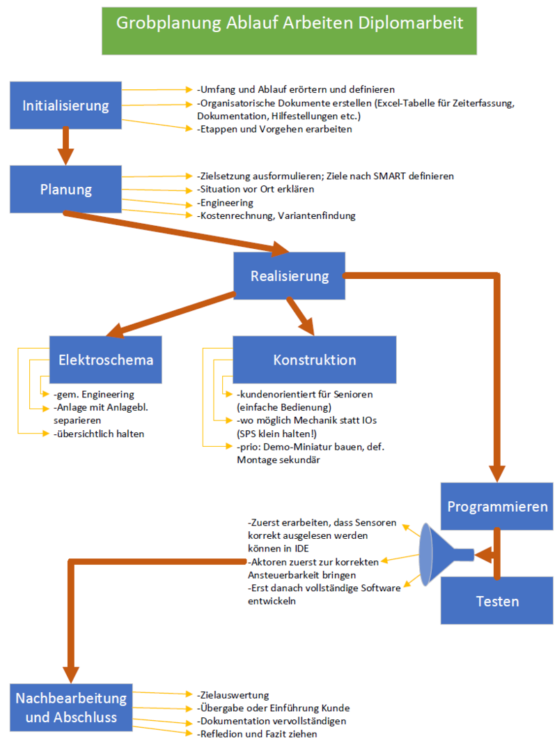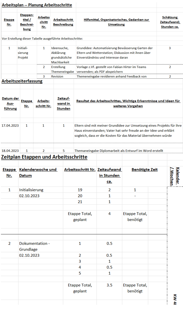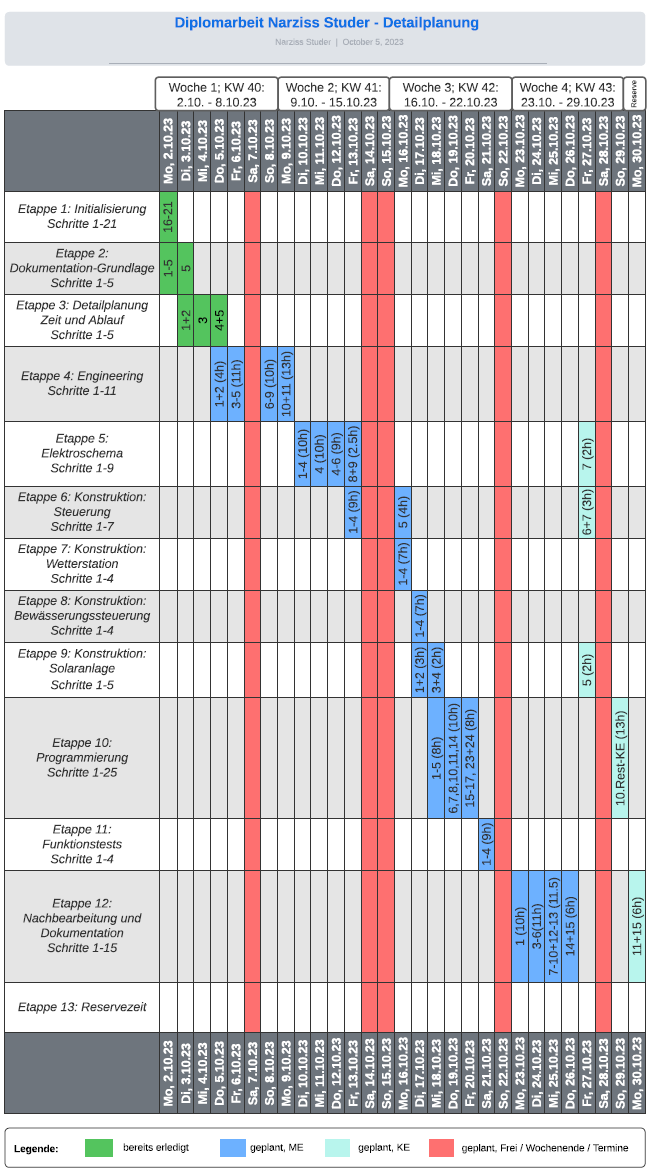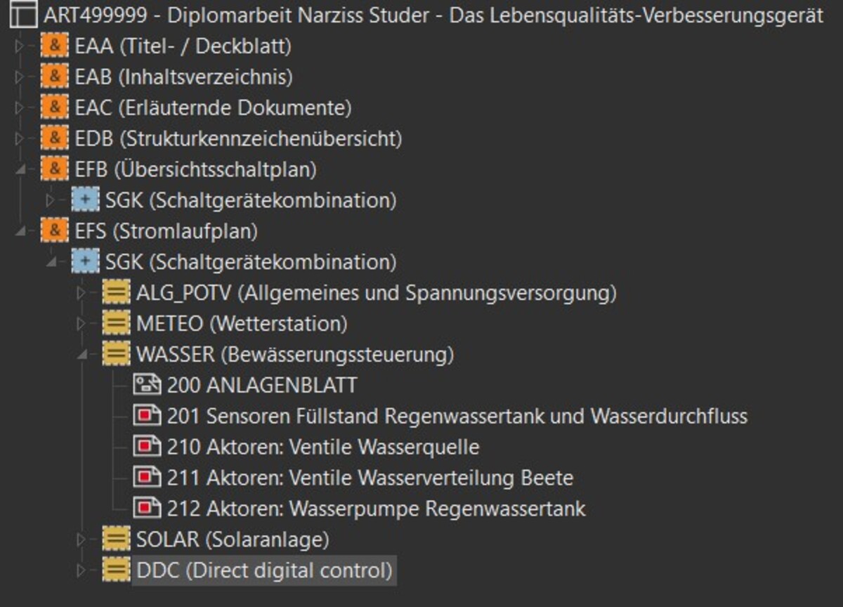 Guten Tag!Es freut mich, dass Sie den Weg auf die Micro-Website meiner Diplomarbeit gefunden haben.Mithilfe dieser Plattform möchte ich Ihnen zeigen, was ich im Rahmen meiner Diplomarbeit geplant, entwickelt, gezeichnet, konstruiert und programmiert habe.Diese Arbeit bildet den Abschluss meines Studiums zum dipl. Techniker HF Elektrotechnik an der TEKO in Bern.Ich wünsche Ihnen viel Vergnügen beim Lesen!Die Arbeit in KürzeAn dieser Stelle möchte ich Ihnen einen Überblick zu Ausgangslange, Inhalt und Umfang meiner Arbeit verschaffen.In der Galerie nach diesem Text, finden Sie zu jeder Etappe einige Bilder und Impressionen, welche den Entstehungs- und Erarbeitungsprozess aufzeigen.Am Ende dieser Seite finden Sie die vollständige Dokumentation als PDF-Download.Rechts neben diesem Text habe ich als ergänzende, technische Unterlagen das Elektroschema sowie eine anschauliche PDF-Version der Software hochgeladen.AusgangslageAller Anfang ist schwer – so (gerade) auch bei einer Arbeit, die einen Umfang von 150-250 Arbeitsstunden haben soll.Wo fängt man bei so etwas Grossem an?Tief durchatmen, Kaffee trinken, ins Grüne schauen, und dann: Das Fundament auslegen. Worum geht's? Wo komme ich her, wo bin ich und wo will ich hin?Ich komme von einer Lehre als Automatiker, beschäftige mich beruflich vor Allem mit Umbau und Anpassung von elektrischen Schaltanlagen. Wenn unter den Zuschauertribünen des Wankdorfstadions ein Fitnesscenter aus- und eine Hirslanden-Klinik einzieht, dabei aber irgendwie möglichst viel bestehende Infrastruktur übernommen werden soll – dann bin ich in meinem Element.Mithilfe meines beruflichen Fachwissens, den (Er-)Kenntnissen aus meinem Studium an der TEKO und ein Bisschen Flair für Elektrotechnik, wollte ich eine Anlage erstellen, welche meinen Eltern etwas Abhilfe schafft, bei einigen lange bekannten, aber nie gelösten Problem.Besagte Eltern bestellen gerne den Garten, gehen oft in die Ferien und verbringen (un-)freiwillig viel Zeit rauchend unter dem Pavillon ihres Hauses.Diesen drei Problematiken wollte ich in Form einer elektrischen Anlage Abhilfe schaffen, um ihnen ein wenig mehr Lebensqualität zu ermöglichen. So entstand das Lebensqualitäts-Verbesserungsgerät.Daraus entstand ein Projekt in 7 Akten:1. Initialisierung2. Planung3. Engineering4. Elektroschema5. Konstruktion6. Programmierung7. Nachbearbeitung und AuswertungDie Szenen jedes Aktes finden sie in der nachfolgenden Galerie. Vorhang auf!