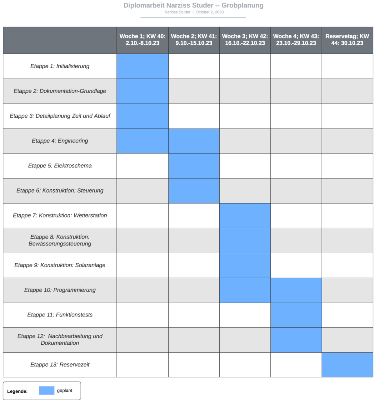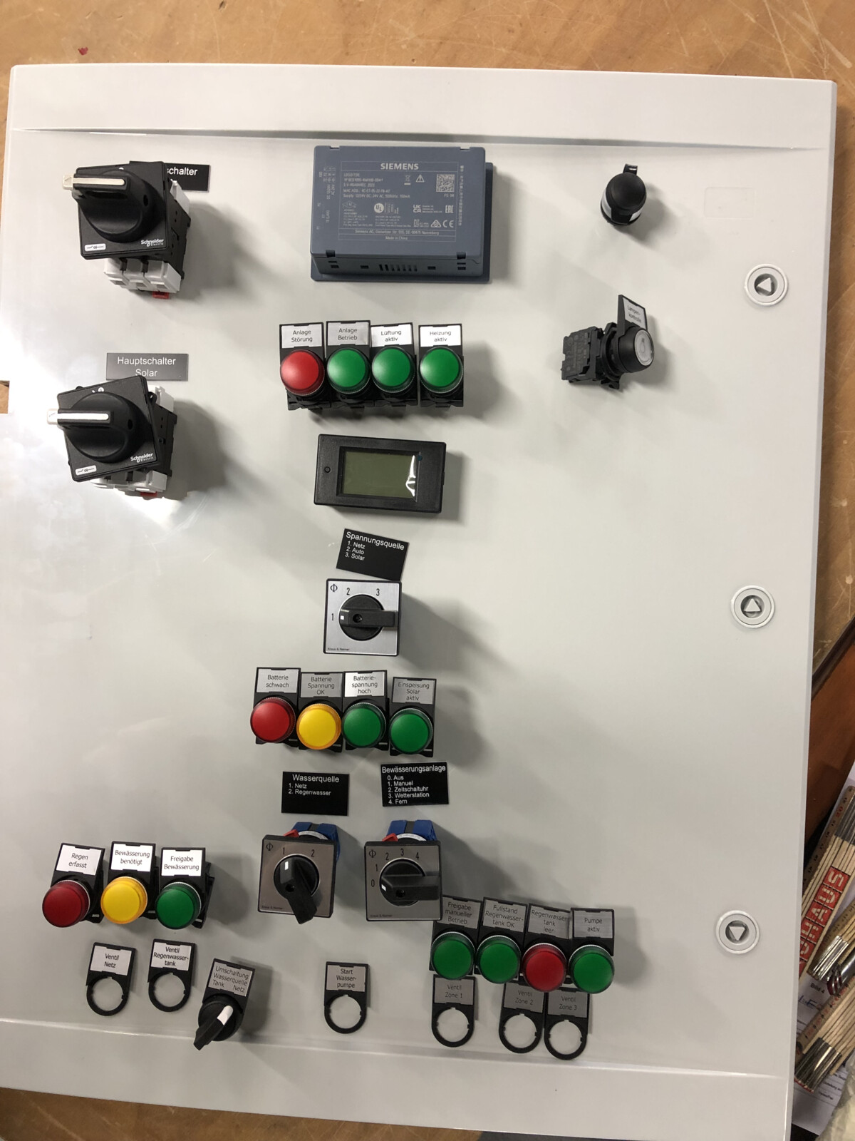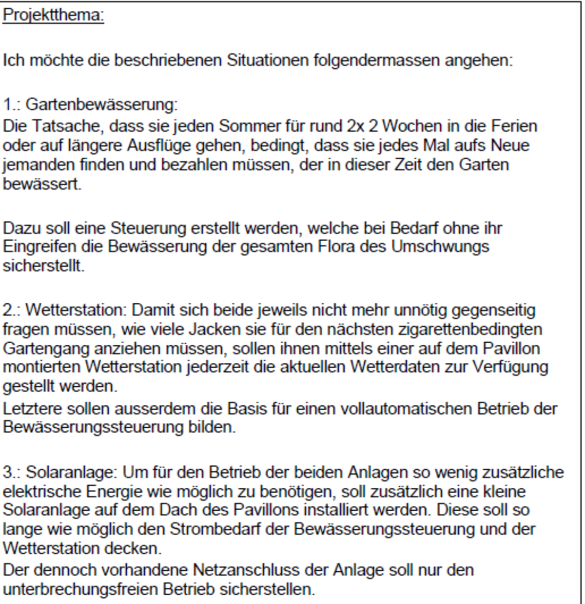 Guten Tag!Es freut mich, dass Sie den Weg auf die Micro-Website meiner Diplomarbeit gefunden haben.Mithilfe dieser Plattform möchte ich Ihnen zeigen, was ich im Rahmen meiner Diplomarbeit geplant, entwickelt, gezeichnet, konstruiert und programmiert habe.Diese Arbeit bildet den Abschluss meines Studiums zum dipl. Techniker HF Elektrotechnik an der TEKO in Bern.Ich wünsche Ihnen viel Vergnügen beim Lesen!Die Arbeit in KürzeAn dieser Stelle möchte ich Ihnen einen Überblick zu Ausgangslange, Inhalt und Umfang meiner Arbeit verschaffen.In der Galerie nach diesem Text, finden Sie zu jeder Etappe einige Bilder und Impressionen, welche den Entstehungs- und Erarbeitungsprozess aufzeigen.Am Ende dieser Seite finden Sie die vollständige Dokumentation als PDF-Download.Rechts neben diesem Text habe ich als ergänzende, technische Unterlagen das Elektroschema sowie eine anschauliche PDF-Version der Software hochgeladen.AusgangslageAller Anfang ist schwer – so (gerade) auch bei einer Arbeit, die einen Umfang von 150-250 Arbeitsstunden haben soll.Wo fängt man bei so etwas Grossem an?Tief durchatmen, Kaffee trinken, ins Grüne schauen, und dann: Das Fundament auslegen. Worum geht's? Wo komme ich her, wo bin ich und wo will ich hin?Ich komme von einer Lehre als Automatiker, beschäftige mich beruflich vor Allem mit Umbau und Anpassung von elektrischen Schaltanlagen. Wenn unter den Zuschauertribünen des Wankdorfstadions ein Fitnesscenter aus- und eine Hirslanden-Klinik einzieht, dabei aber irgendwie möglichst viel bestehende Infrastruktur übernommen werden soll – dann bin ich in meinem Element.Mithilfe meines beruflichen Fachwissens, den (Er-)Kenntnissen aus meinem Studium an der TEKO und ein Bisschen Flair für Elektrotechnik, wollte ich eine Anlage erstellen, welche meinen Eltern etwas Abhilfe schafft, bei einigen lange bekannten, aber nie gelösten Problem.Besagte Eltern bestellen gerne den Garten, gehen oft in die Ferien und verbringen (un-)freiwillig viel Zeit rauchend unter dem Pavillon ihres Hauses.Diesen drei Problematiken wollte ich in Form einer elektrischen Anlage Abhilfe schaffen, um ihnen ein wenig mehr Lebensqualität zu ermöglichen. So entstand das Lebensqualitäts-Verbesserungsgerät.Daraus entstand ein Projekt in 7 Akten:1. Initialisierung2. Planung3. Engineering4. Elektroschema5. Konstruktion6. Programmierung7. Nachbearbeitung und AuswertungDie Szenen jedes Aktes finden sie in der nachfolgenden Galerie. Vorhang auf!