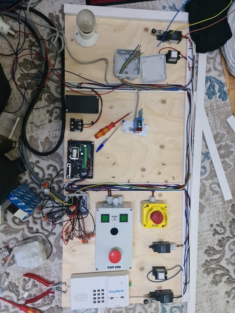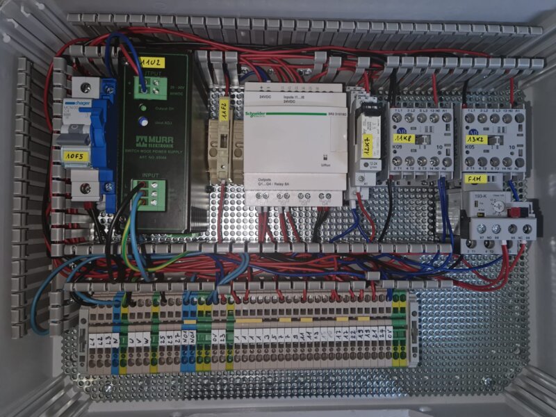 Die Stromversorgung erfolgt direkt über eine Steckdose mit einem 3x1,5-Kabel. Bestimmte Komponenten des Schaltkastens und der Plattform erfordern Schutzleiter. Für die Steuerkabel der Komponenten und Sicherheitselemente habe ich das 12x1,5-Kabel direkt an die Ausgangsklemme angeschlossen. Um Komponenten, die eine Spannung von 230 V benötigen, habe ich einen 5x 1,5 Kabel verwendet. Ich habe die beiden Kabel direkt zu den beiden Anschlusskasten verlegt.