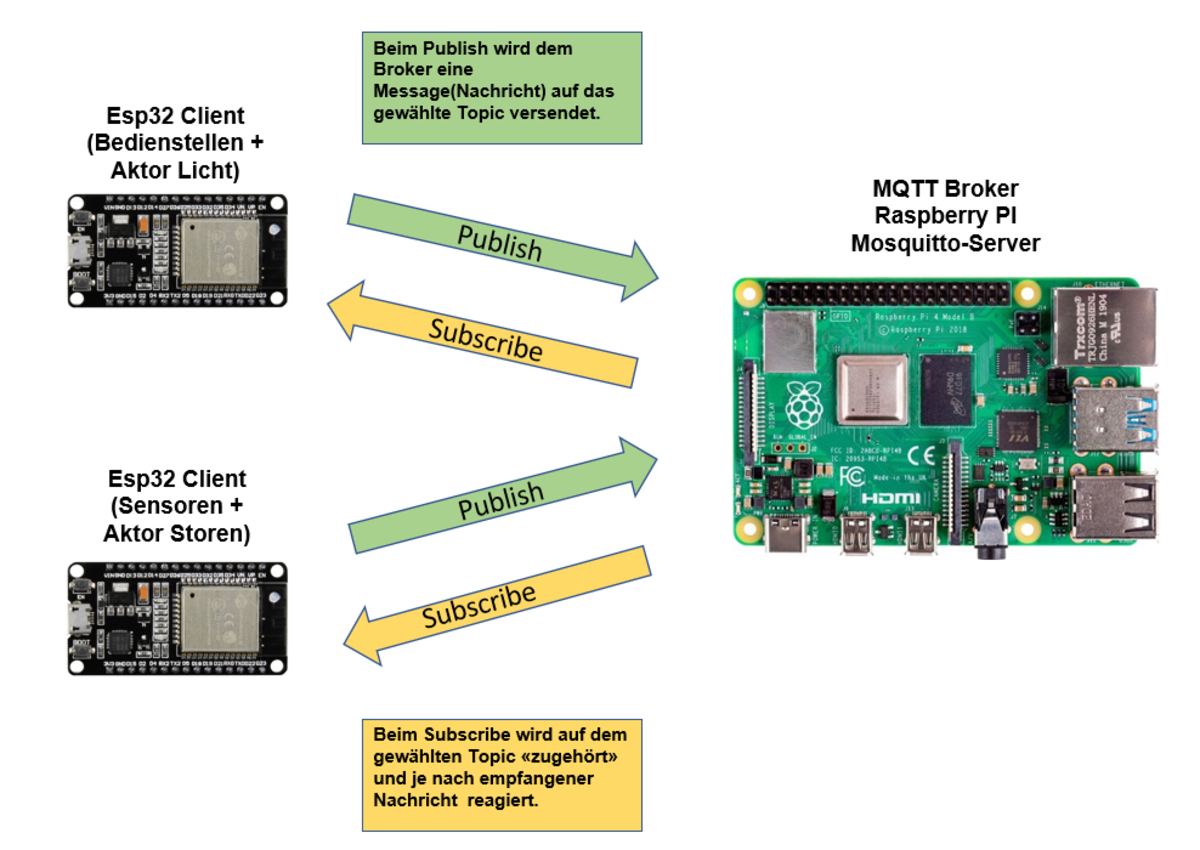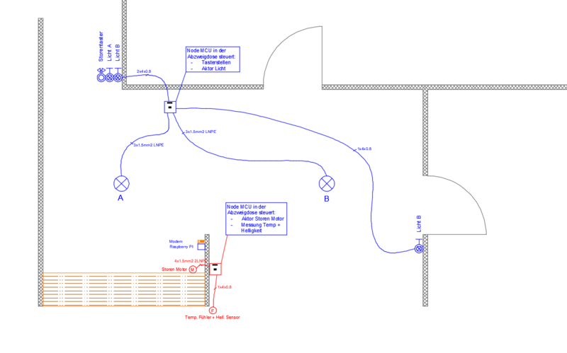 Mit den Teilsystemen Esp32 NodeMcu, Raspberry PI und Node-Red soll es ermöglicht werden, die Beleuchtung sowie die Storen per Smartphone zu steuern und eine konventionelle Bedienung durch die Schaltstellen zu gewährleisten. Zudem sollen die Storen einen Motor erhalten, da diese noch per Kurbel bedient werden.