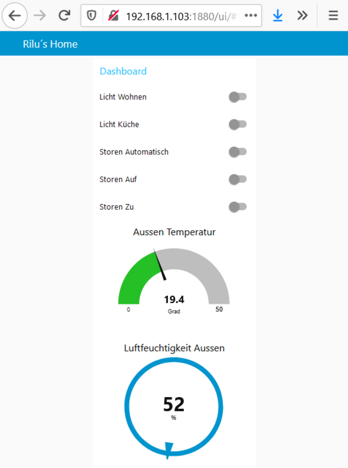Ergebnis: Das Dashboard wurde über das NodeRed erstellt und führt alle Funktionen aus sowie zusätzlich einer Temperaturanzeige es kann über den Browser vom Smartphone sowie vom Computer aus erreicht werden.
