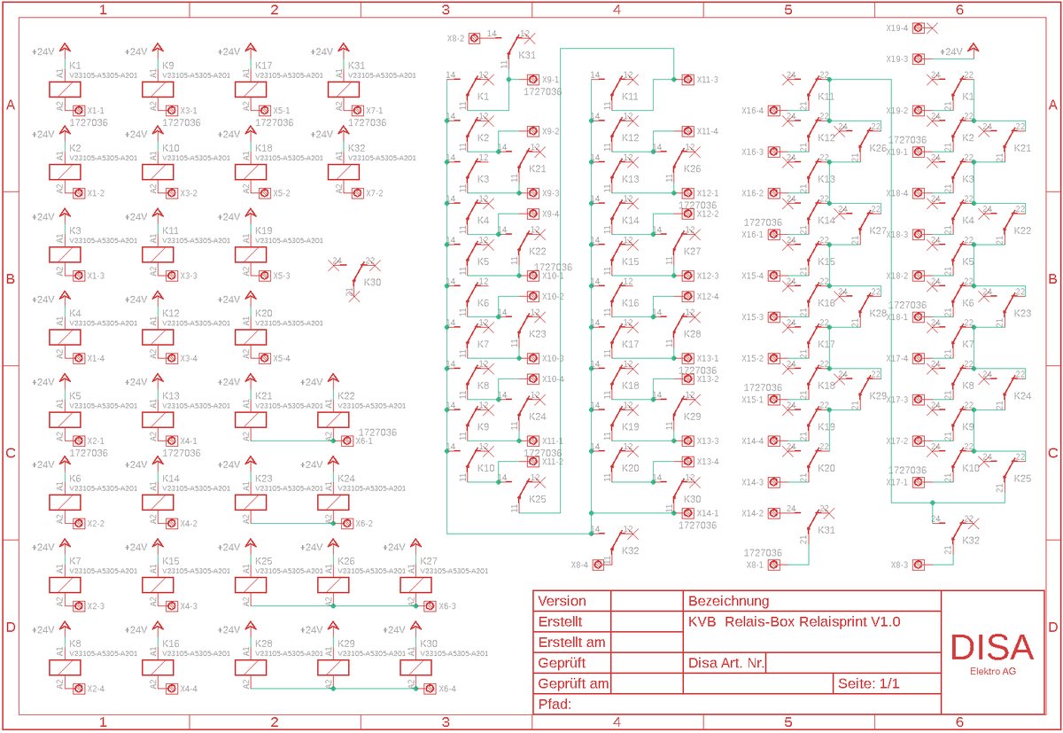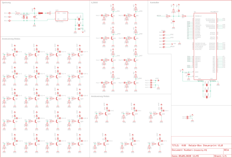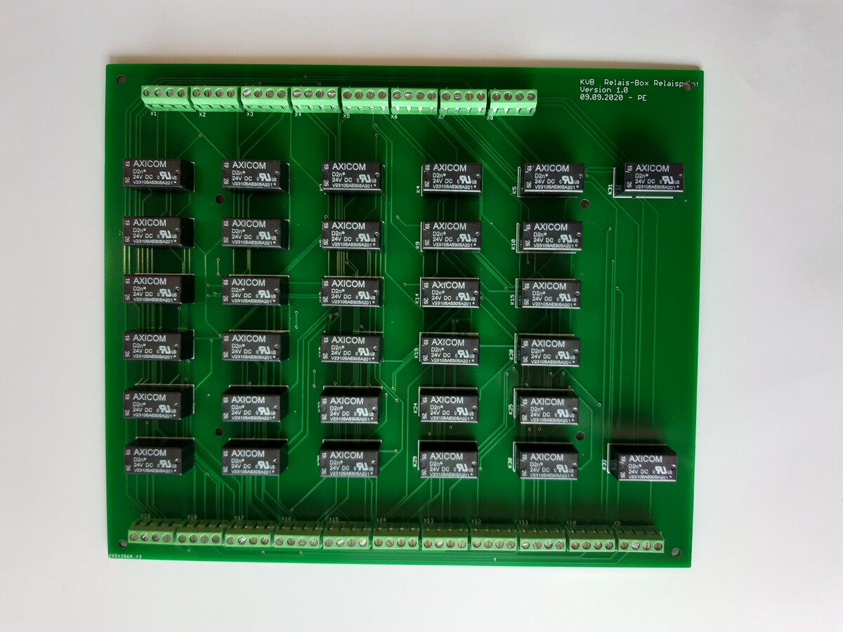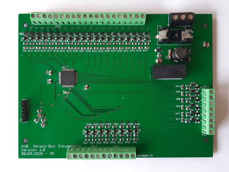 Die Relaisbox schaltet die Kabel der KVB's, so dass sie in Serie für die Durchgangsprüfung und Parallel für die ISO-Prüfung sind. Sie wird über einen Parallelport mit dem ISO-Prüfgerät verbunden. In der Relaisbox befindet sich ein Microcontroller der die Eingangssignale bearbeitet und einzeln die Relais ansteuert.