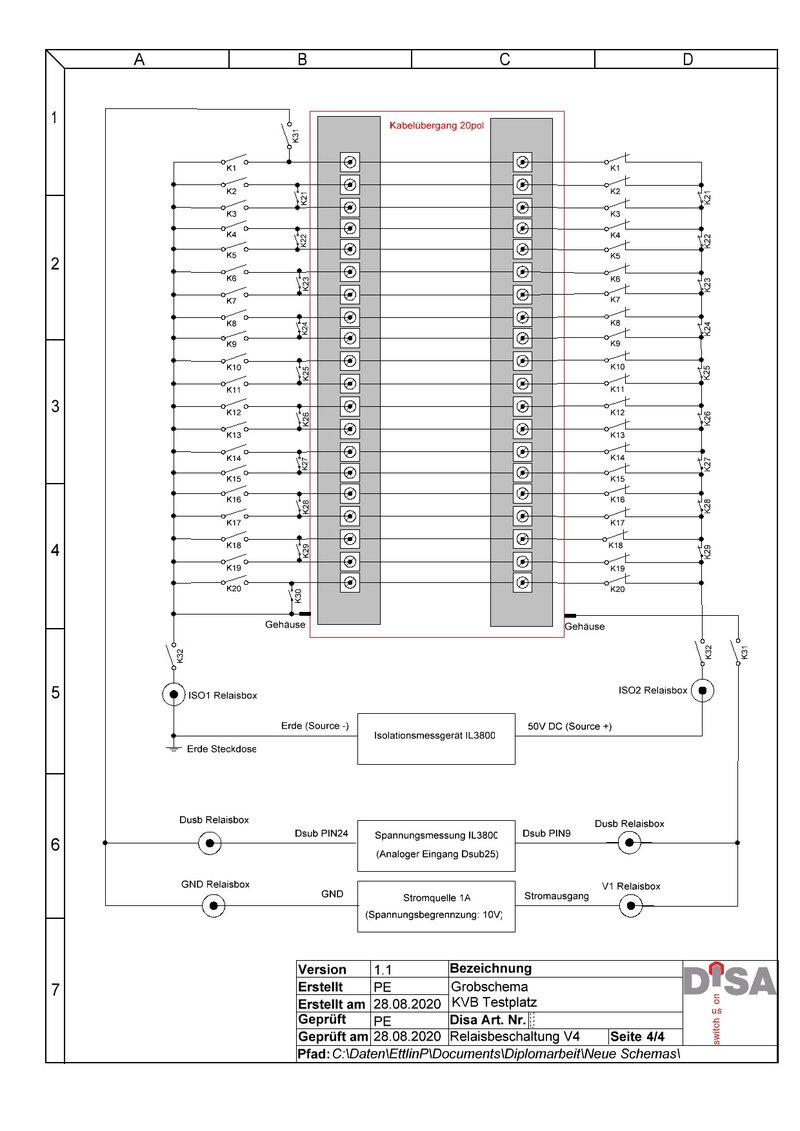 Meine Diplomarbeit durfte ich in der Firma DISA Elektro AG, in welcher ich arbeite, umsetzen. Ich wollte mich einem Thema widmen, das ich interessant finde und auch von Nutzen für die Firma ist. So habe ich entdeckt, dass der Testplatz für die KVB (Kabelverbindungen für Sicherheitstüren) veraltet ist und ersetzt werden sollte. Diese KVB's werden auf Durchschlag sowie auf Isolation getestet. Ich erstellte einen neuen KVB-Testplatz, bei dem es möglich ist, die ISO-Prüfung und die Durchgangsprüfung nacheinander selbständig auszuführen. Im jetzigen Zustand müssen verschiedene Testadapter verwendet werden. Dies erfordert jeweils viel Zeit beim Umstecken. Mit meinem Projekt kann diese Zeit eingespart werden und die Prüfungen sind einfacher umzusetzen.