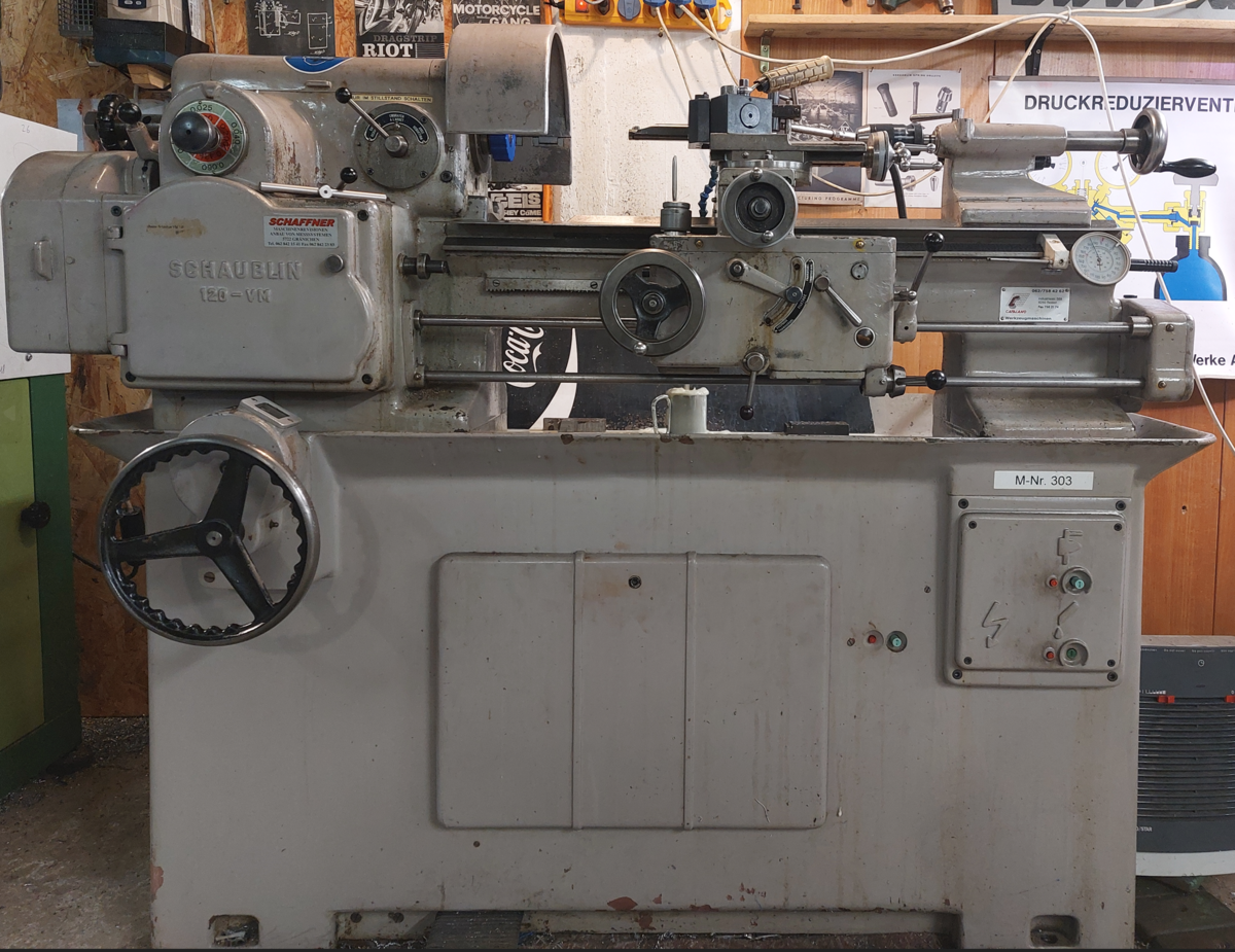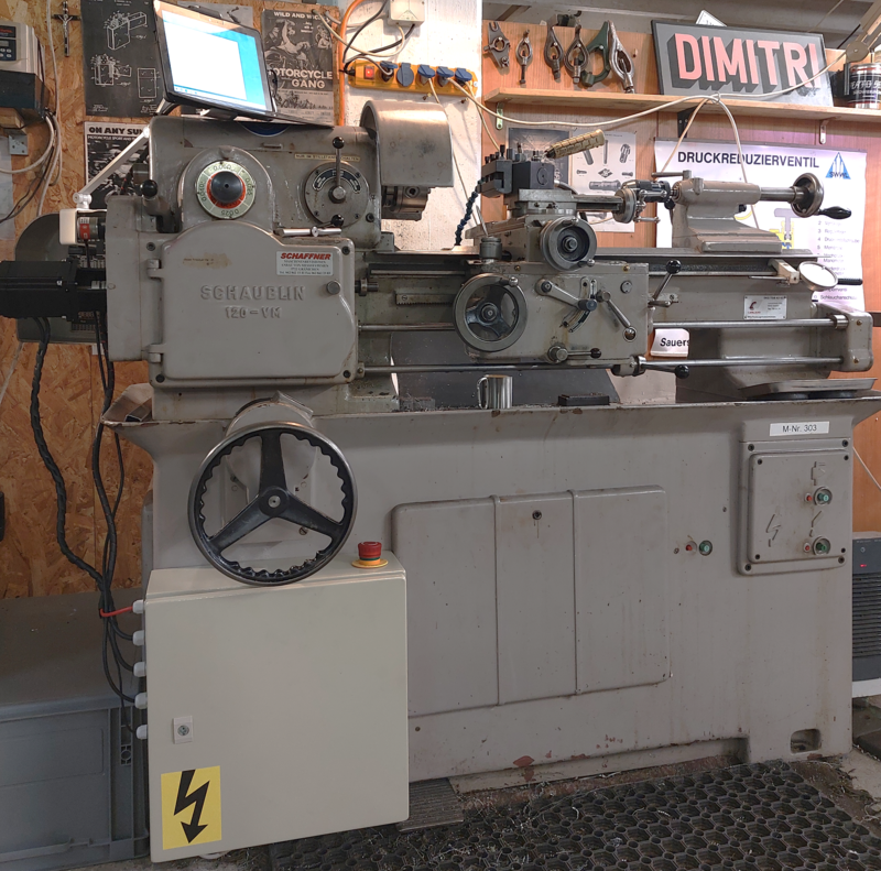 Beim Gewindedrehen mit meiner Drehmaschine (Modell Schaublin 120 VM, Baujahr 1962) entsteht jeweils ein erheblicher Zeitaufwand für das Umrüsten des Getriebekastens. Es müssen mehrere Zahnräder und die entsprechenden Achsverbindungen ausgetauscht werden. Dies dauert oft länger als die eigentlichen Dreharbeiten. Um diesen Aufwand zu minimieren, habe ich mich entschieden, das mechanische Getriebe durch eine elektronisch gesteuerte Übersetzung zu ersetzen.