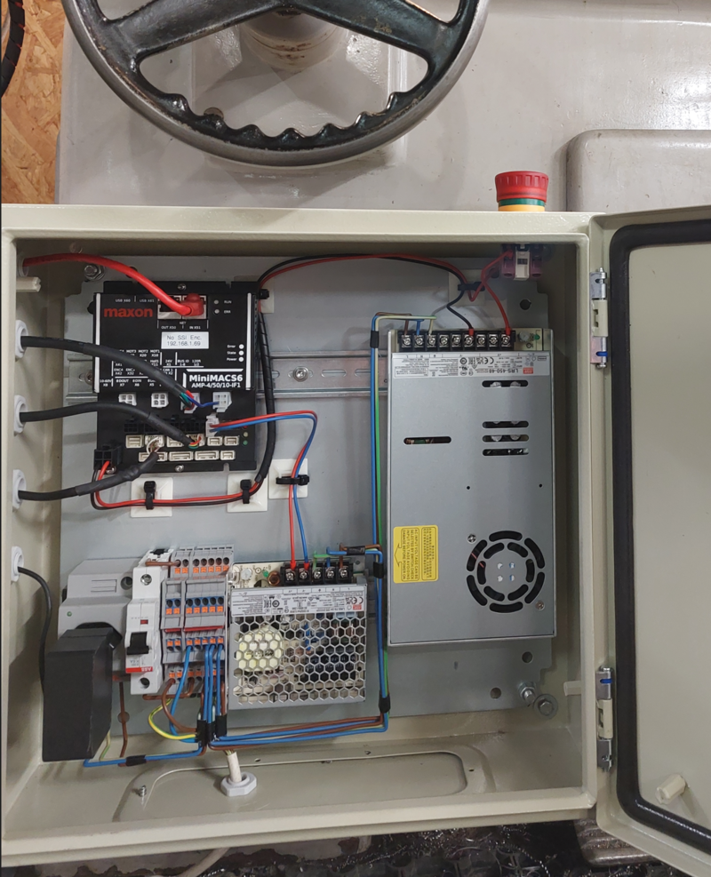- Ein Schaltkasten welcher an der Drehmaschine montiert wurde und sowohl die Steuerung sowie die entsprechenden Speisungen für Steuerung und Motor enthält.